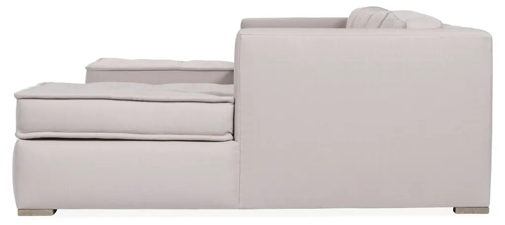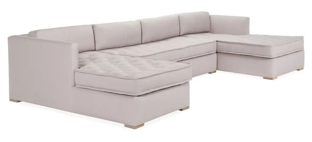 Designed by us and available only at One Kings Lane: Framed in reclaimed alder and set on block feet in a natural stain, this U-shape modular sectional is sure to impress guests with its clean-lined silhouette and tufted box-style seat cushions. Each module is upholstered in a durable woven fabric that mimics the look and feel of linen, while an ample fill of foam wrapped with Dacron and Trillium ensures long-lasting comfort. We love how this versatile piece can be reconfigured to fit your space.