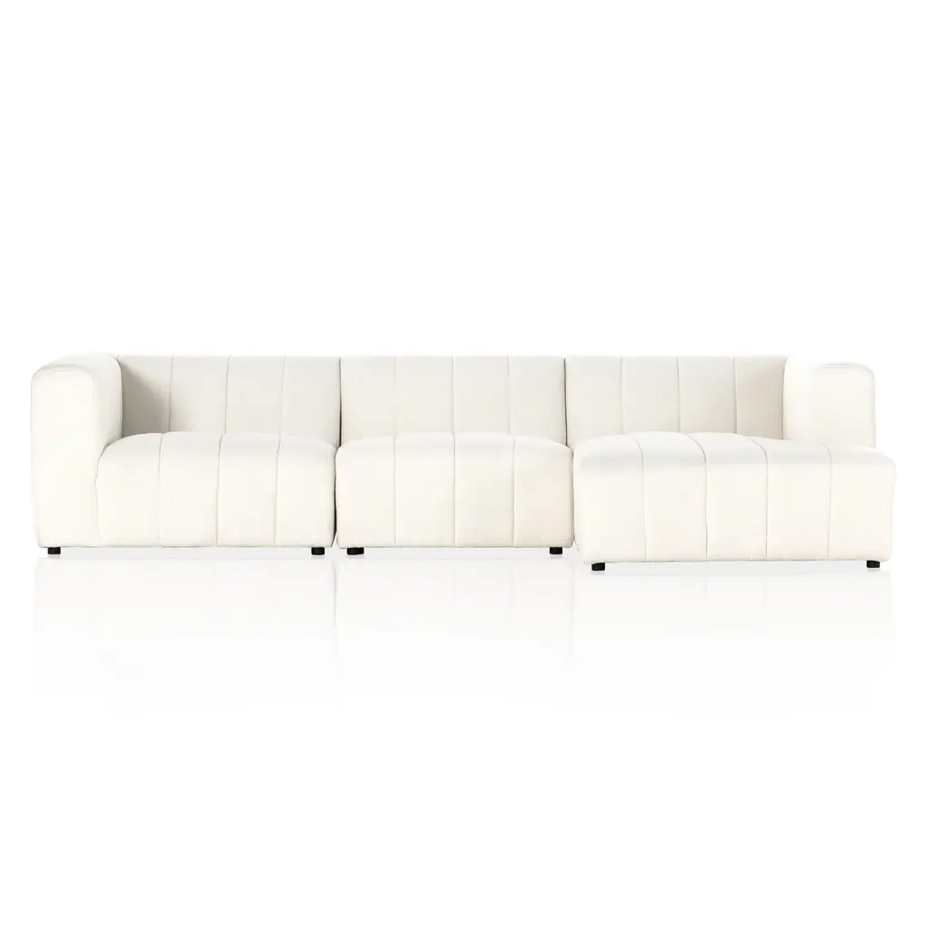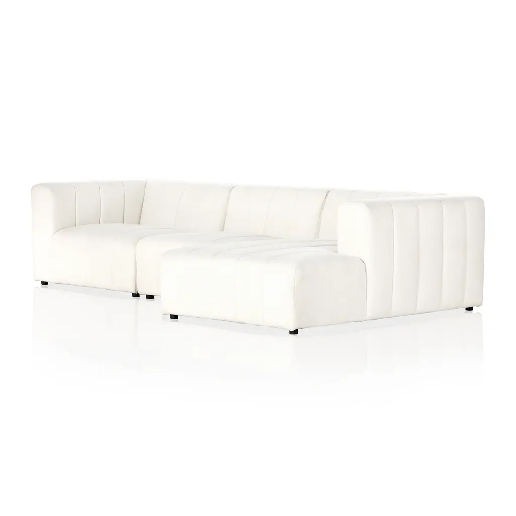 The Langham Channeled 3-Piece Sectional from Four Hands features wide, vertical channeling and a sleek, low-profile design inspired by modern Italian aesthetics. Upholstered in a durable performance fabric that offers exceptional resistance to spills, stains, and wear. This sectional combines sophisticated style with long-lasting comfort, making it an ideal choice for high-traffic living spaces. Highlights