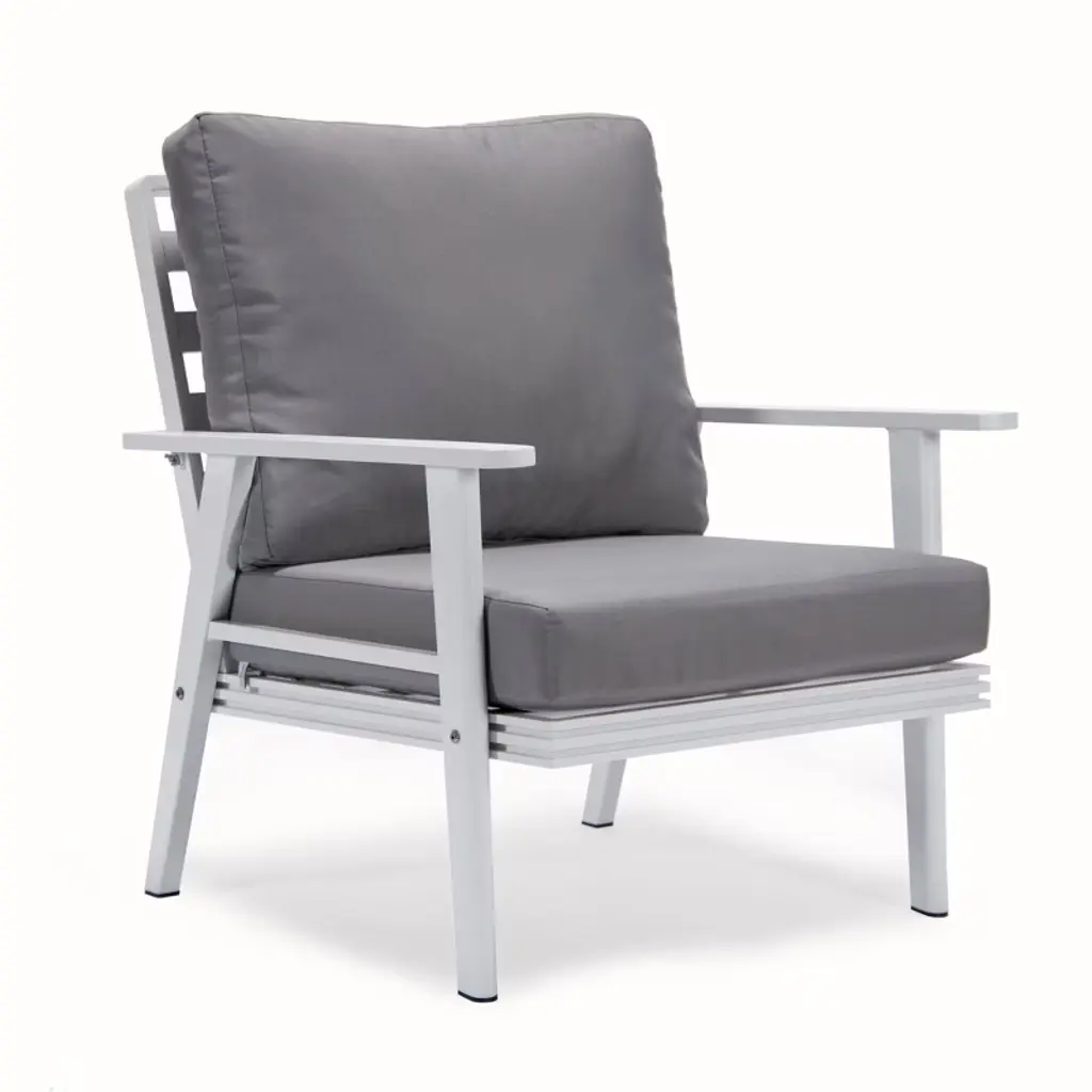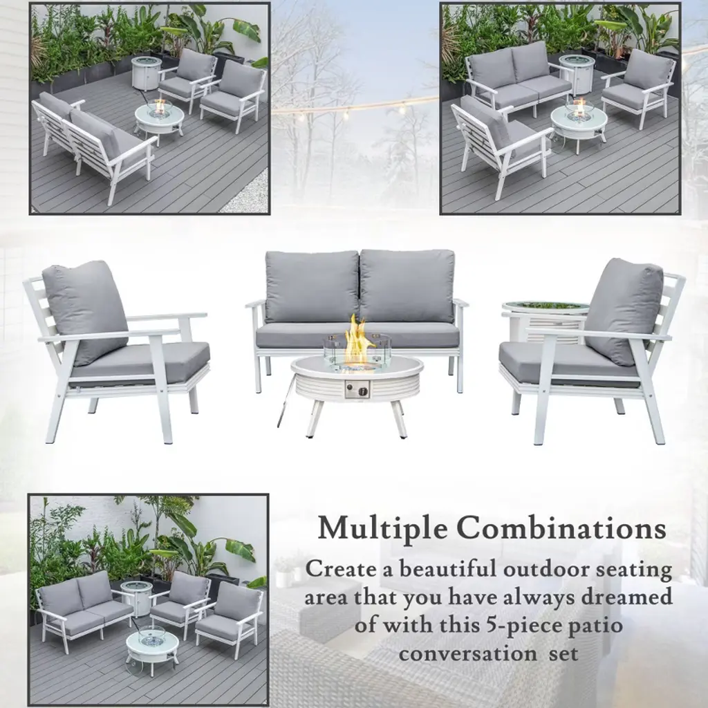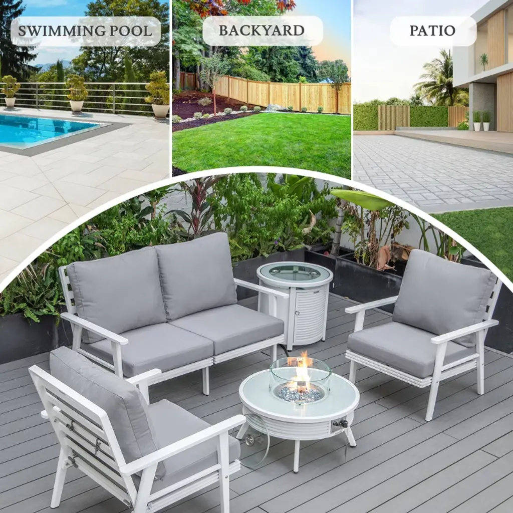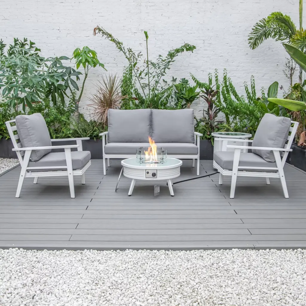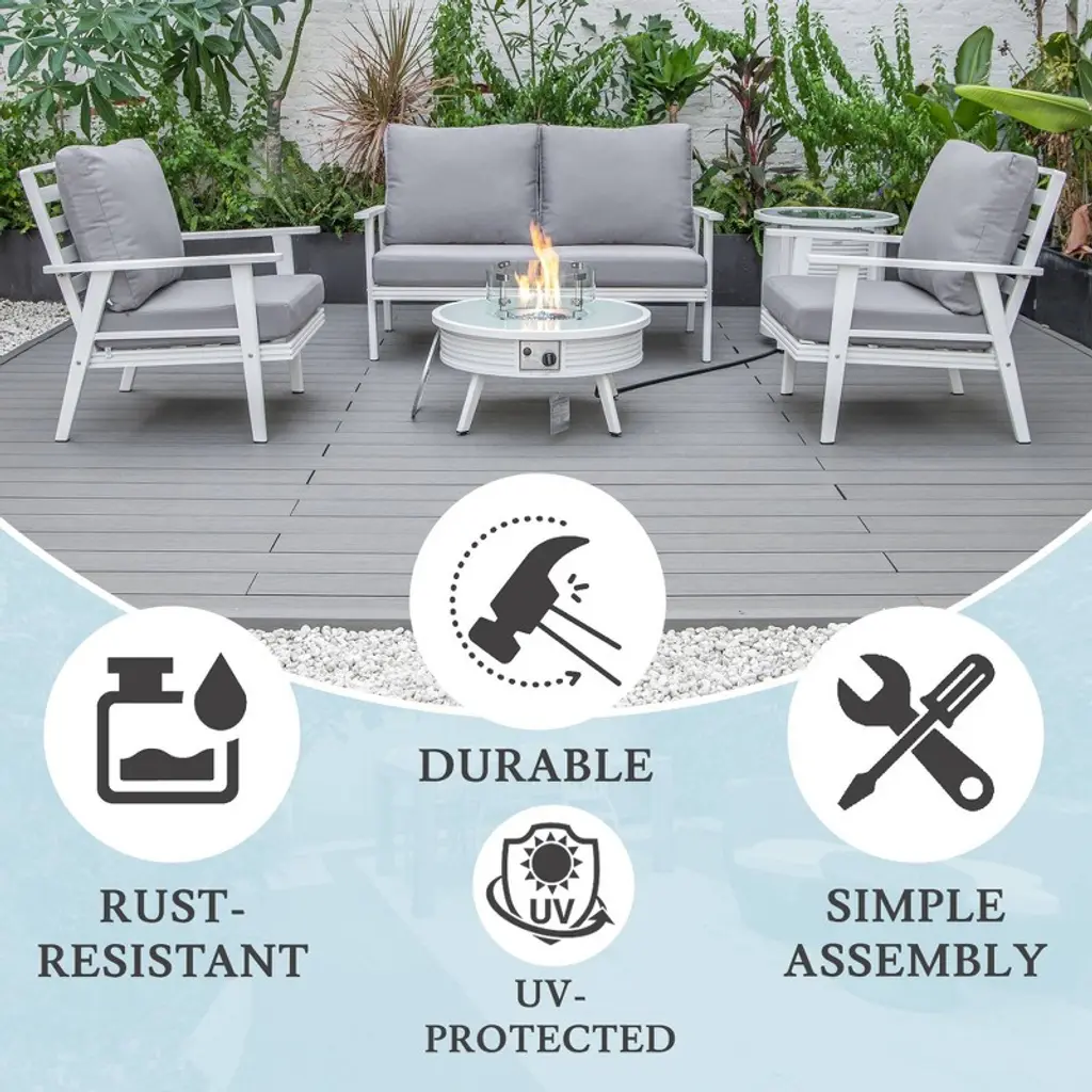 Leisuremod Walbrooke 4-piece Outdoor Patio Conversation Set – White Trim Fire Pit Table With Cushioned Ottoman For Patio, Deck, Balcony & Backyard