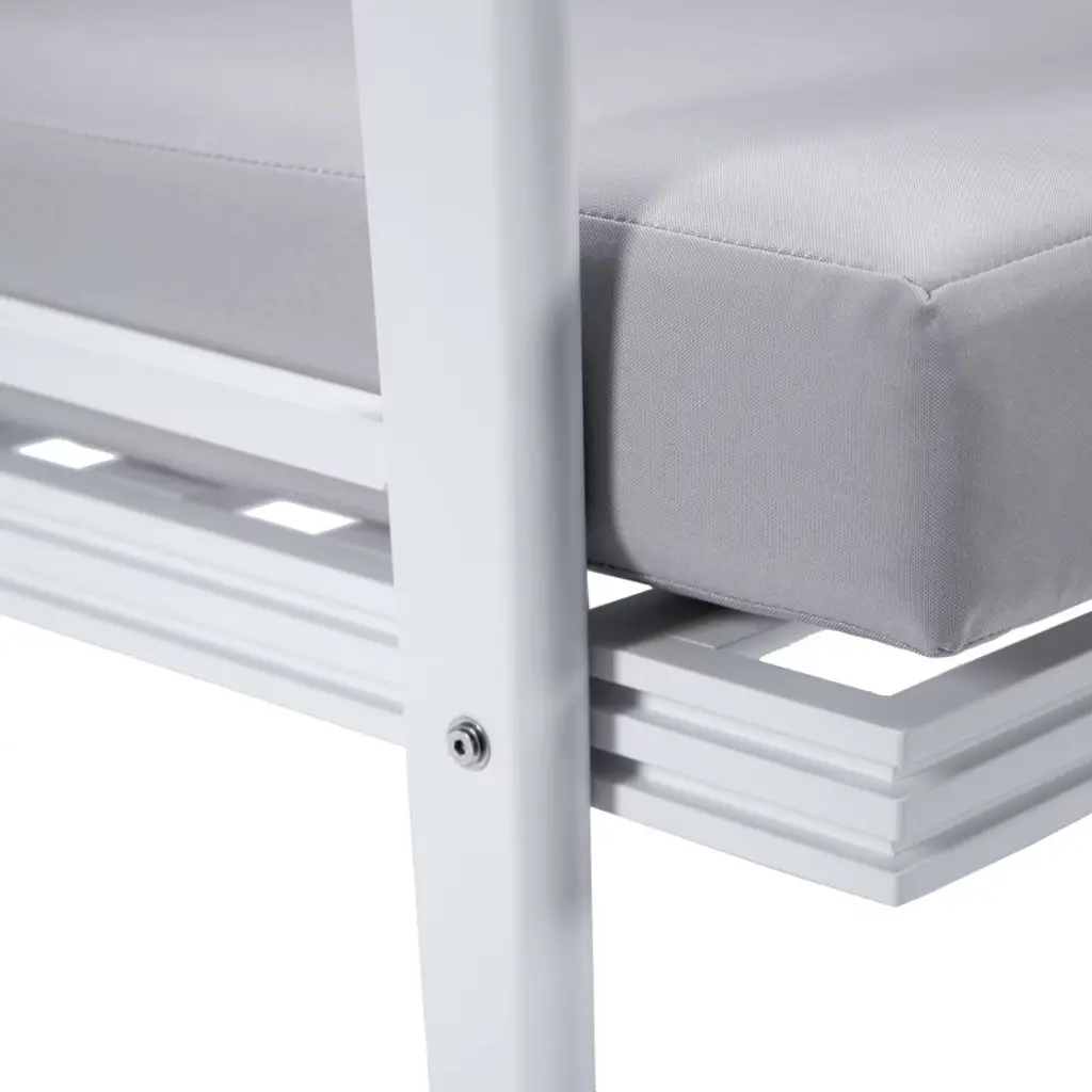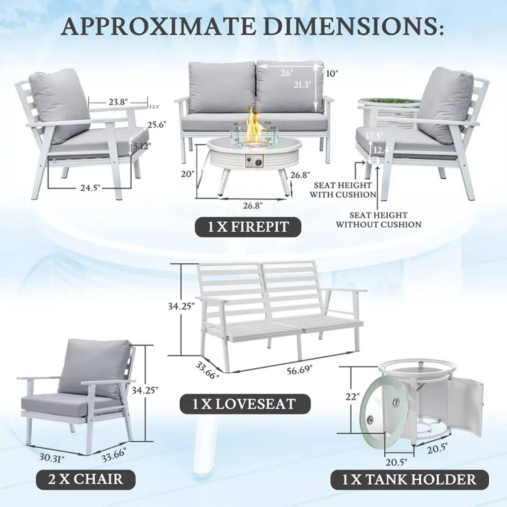 Enjoy cocktails with a friend in your backyard with this inviting Patio conversation set. The Wallbroke collection is the perfect option to relax under the sun or gaze at the stars while enjoying the amazing outdoors. The Set Includes a Loveseat, 2 Armchairs, a Fire Pit Table, and a Tank Holder. The Fire Pit Table will keep you warm during chilly weather. The cushions are stuffed with super-soft, Cotton fill for a custom seating experience. This decorative set is weather-resistant and boasts beautiful powder-coated Aluminum for long-lasting use. The 5-piece Conversation set fits up to 4 adults comfortably and adds the perfect experience to any outdoor space and is a durable choice that can stay in good shape for years. It has a modern style, which brings a timeless feel to your patio.