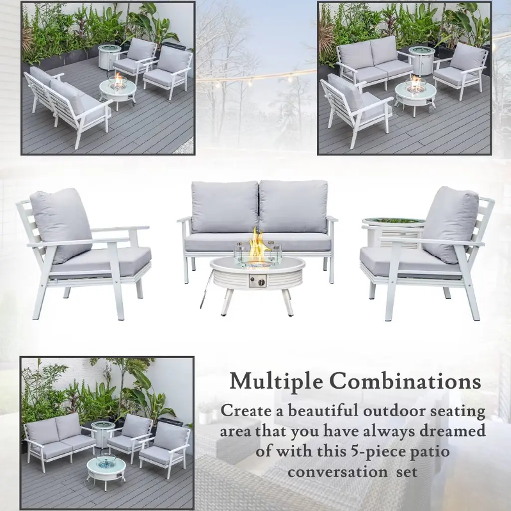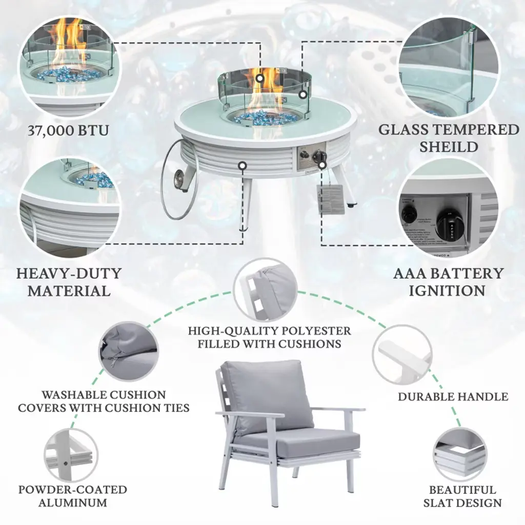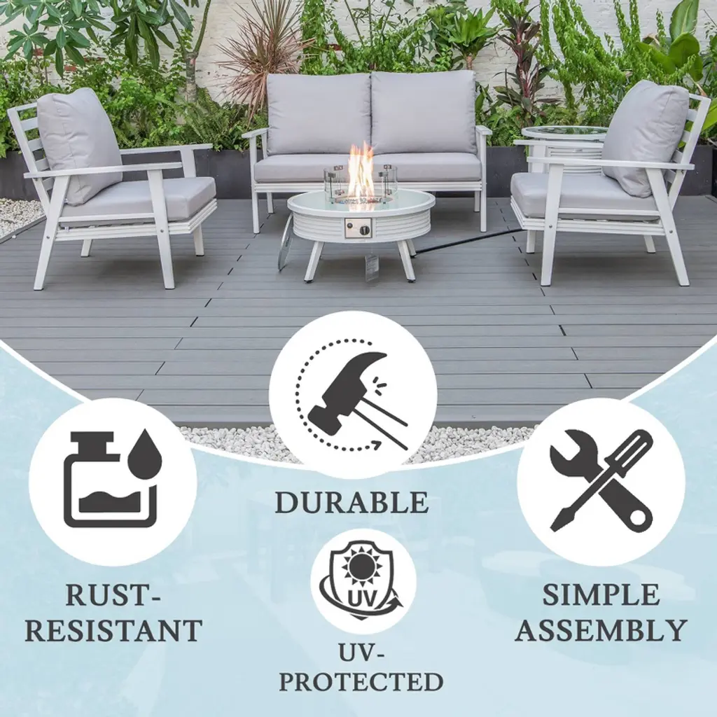 Leisuremod Walbrooke 4-piece Outdoor Patio Conversation Set – White Trim Fire Pit Table With Cushioned Ottoman For Patio, Deck, Balcony & Backyard