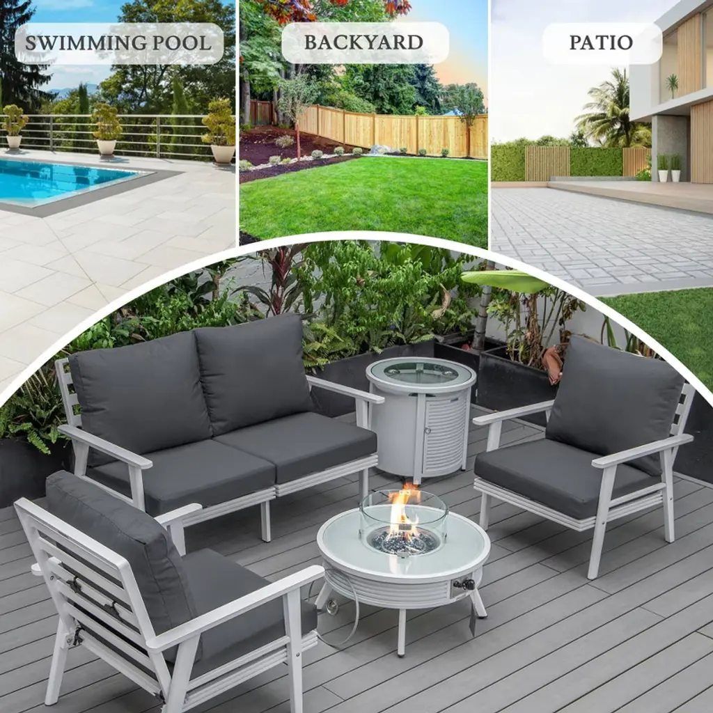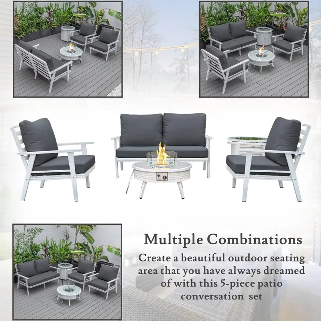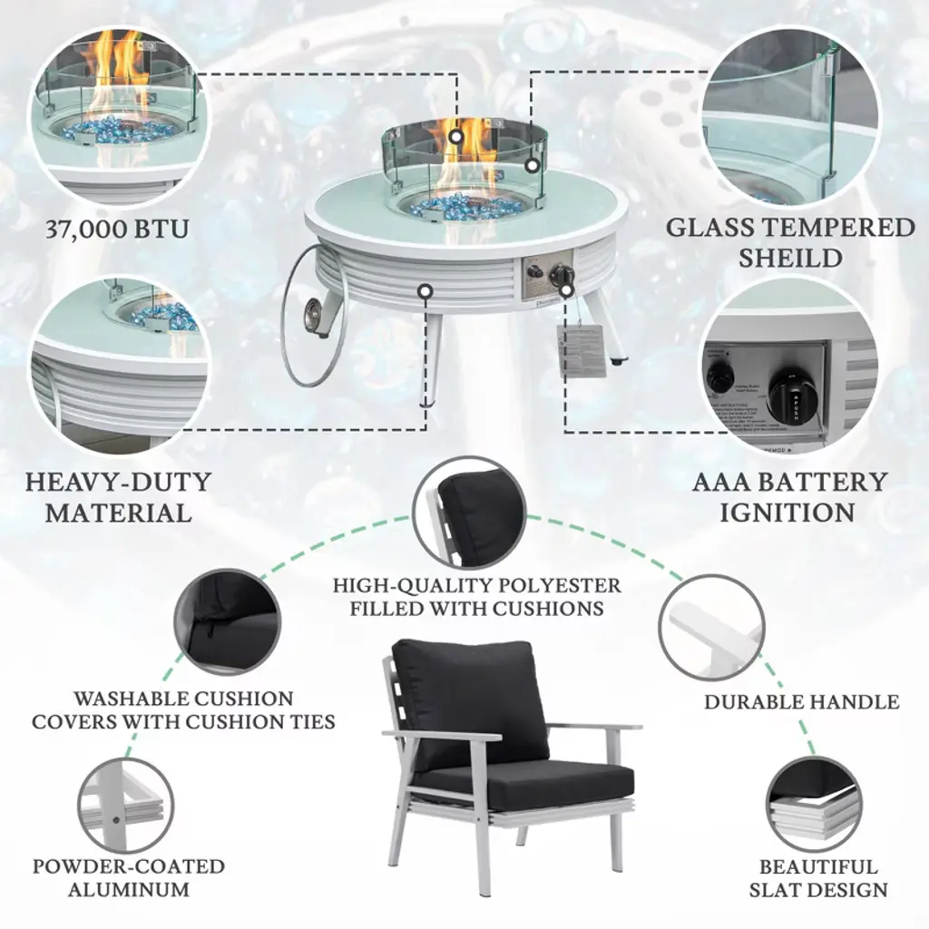 Leisuremod Walbrooke 4-piece Outdoor Patio Conversation Set – White Trim Fire Pit Table With Cushioned Ottoman For Patio, Deck, Balcony & Backyard