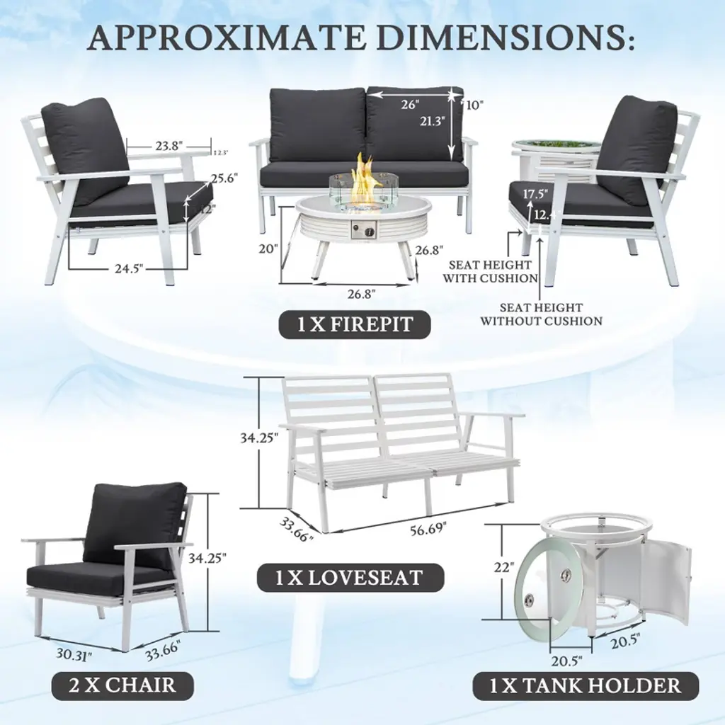 Enjoy cocktails with a friend in your backyard with this inviting Patio conversation set. The Wallbroke collection is the perfect option to relax under the sun or gaze at the stars while enjoying the amazing outdoors. The Set Includes a Loveseat, 2 Armchairs, a Fire Pit Table, and a Tank Holder. The Fire Pit Table will keep you warm during chilly weather. The cushions are stuffed with super-soft, Cotton fill for a custom seating experience. This decorative set is weather-resistant and boasts beautiful powder-coated Aluminum for long-lasting use. The 5-piece Conversation set fits up to 4 adults comfortably and adds the perfect experience to any outdoor space and is a durable choice that can stay in good shape for years. It has a modern style, which brings a timeless feel to your patio.