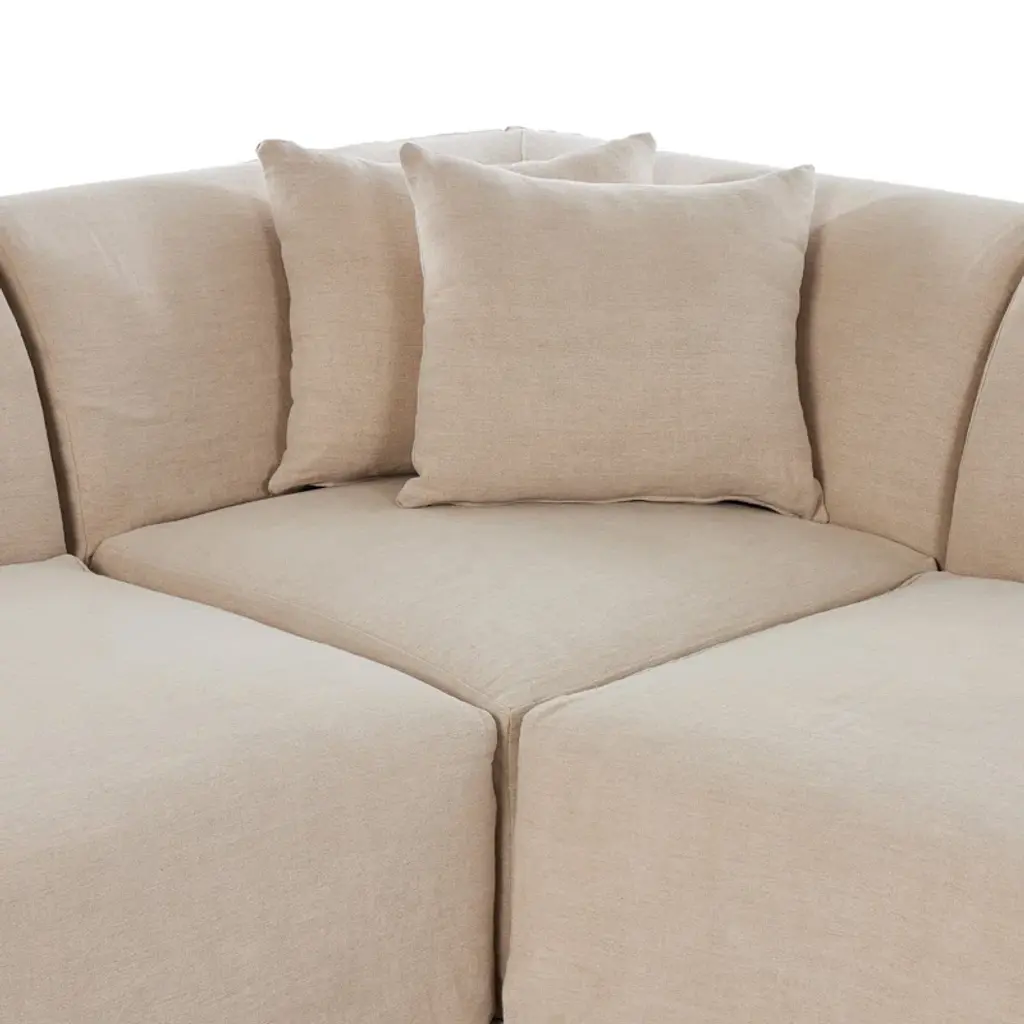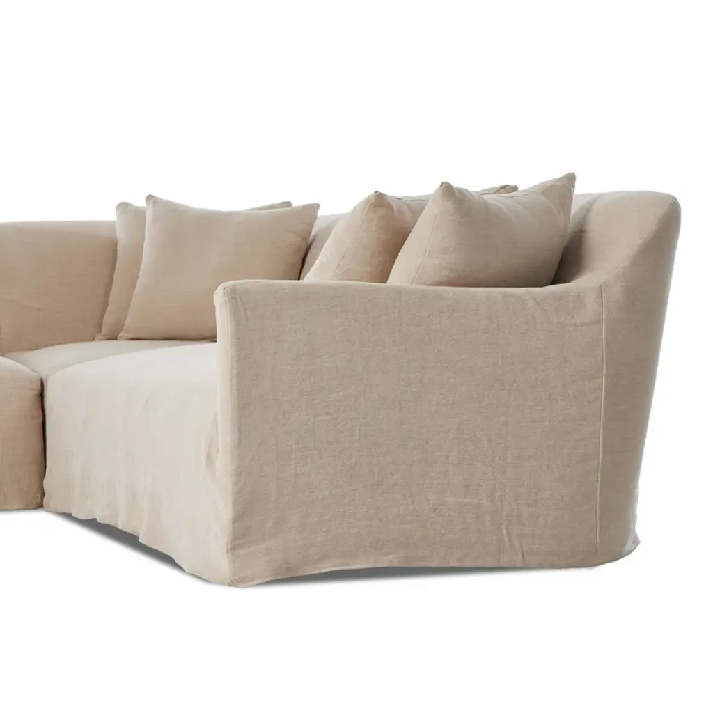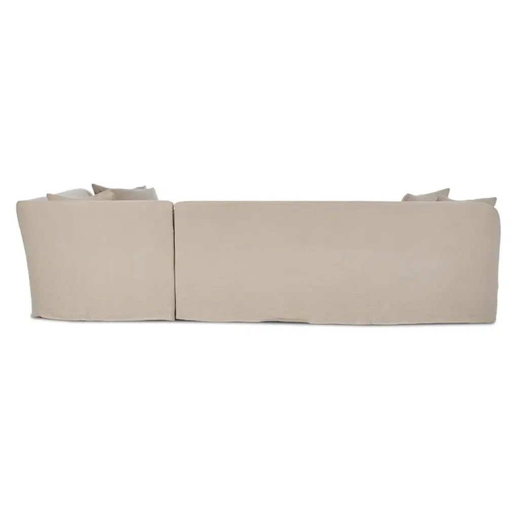 A design collaboration by Amber Lewis and Four Hands. A simple modern design covered in a removable 100% linen slipcover with a tightly tailored look. Sectional is designed with subtle slopes all around and fixed seating with S-spring construction.