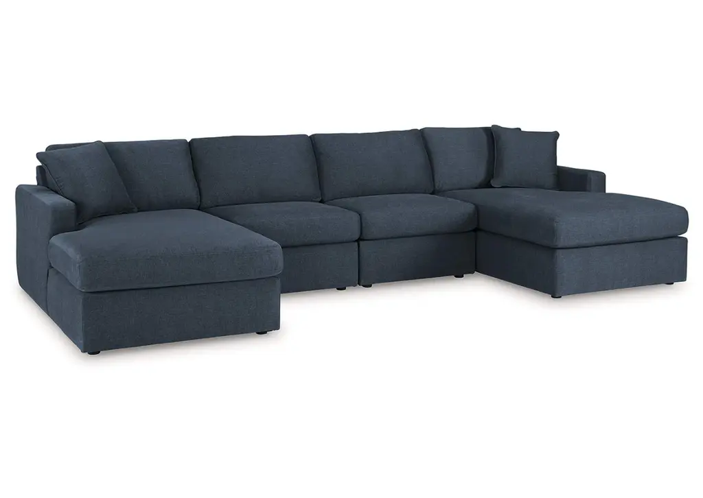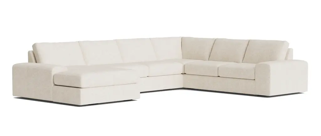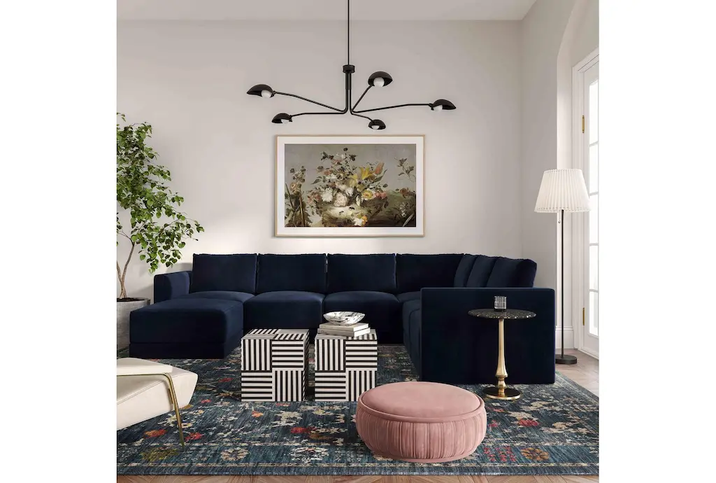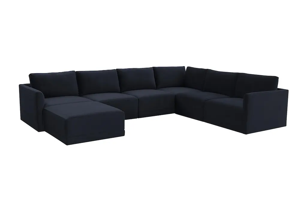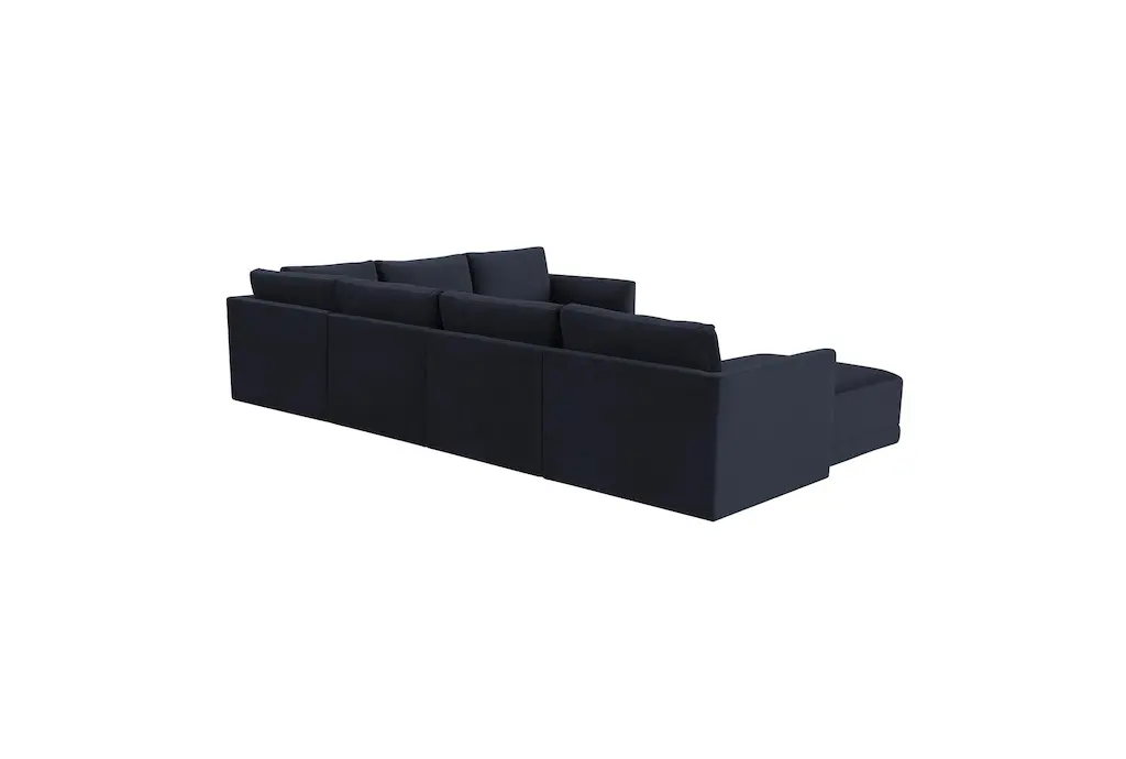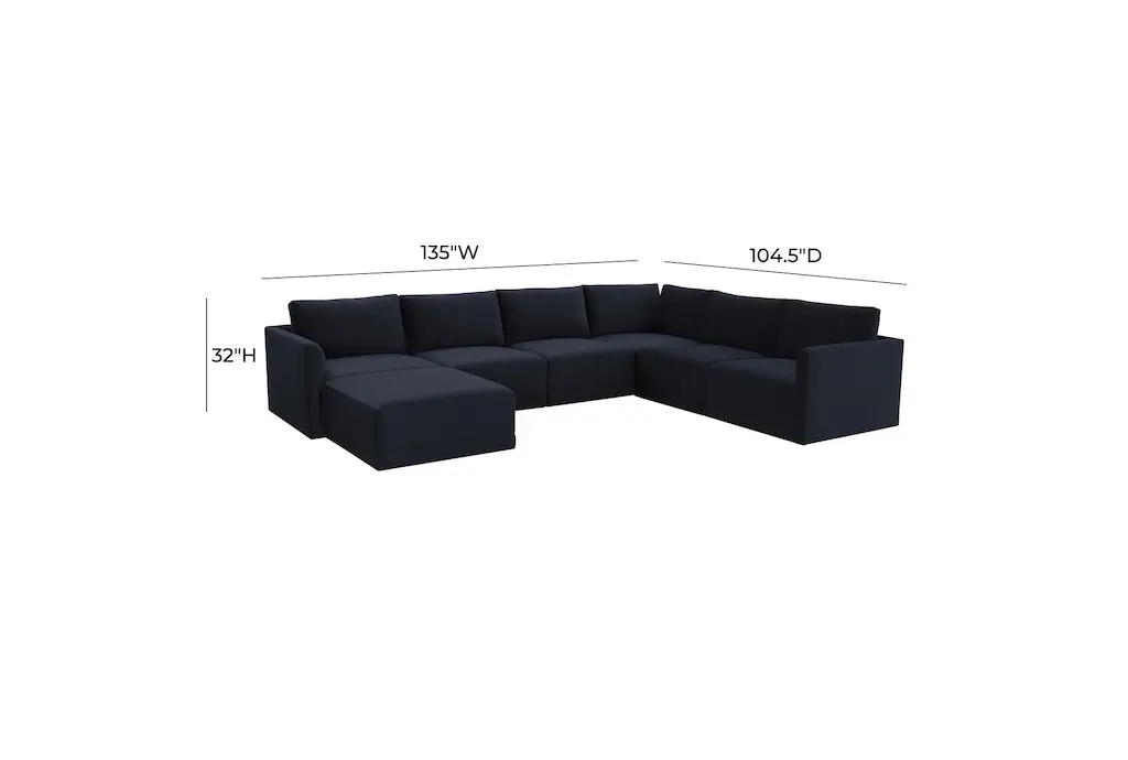 This modern Lyric Navy Velvet 135" 7 Piece U-Shaped Modular Sectional With Reversible Chaise is the perfect addition to any living room. Its modular design and reversible chaise allow for versatile seating arrangements, while the luxurious velvet material adds a touch of elegance to your space.