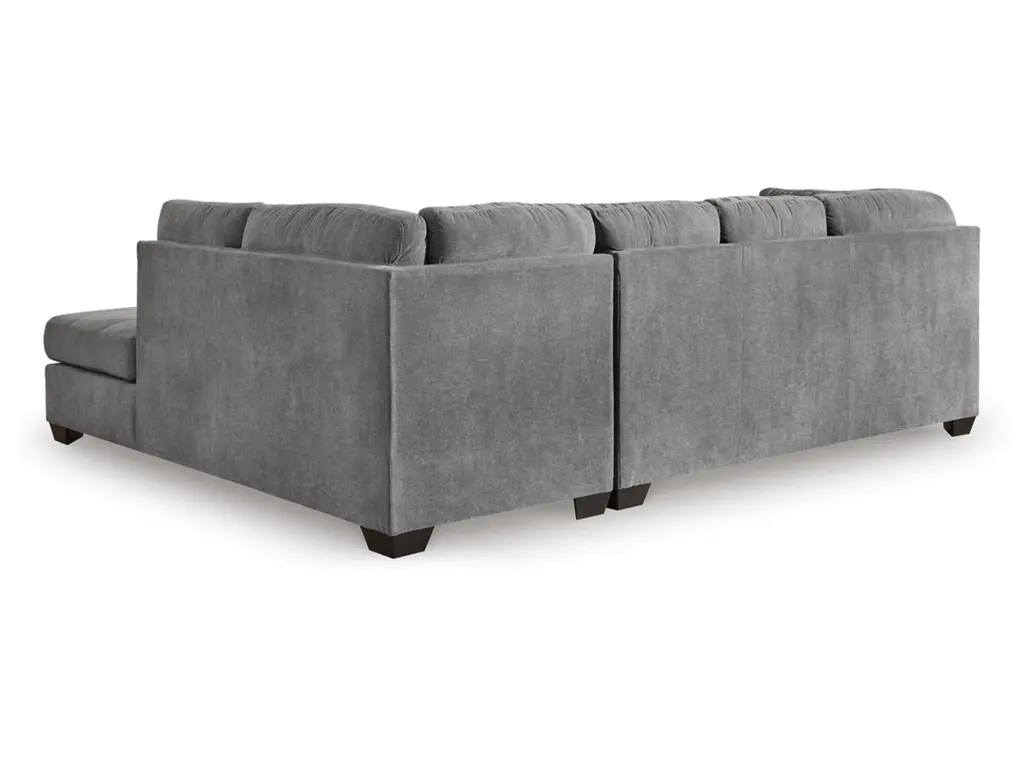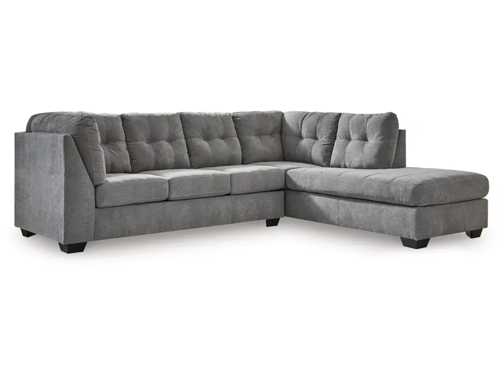 The Marrelton sectional with chaise takes a homey approach to high style. Its gray coloration has classic versatility, while a contemporary silhouette and stitched details keep the look totally on trend. And you can count on comfort—the chaise invites you to kick back and stretch out.