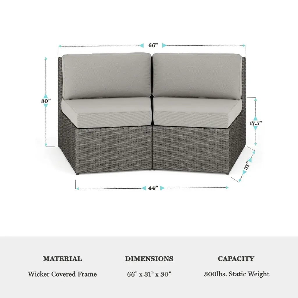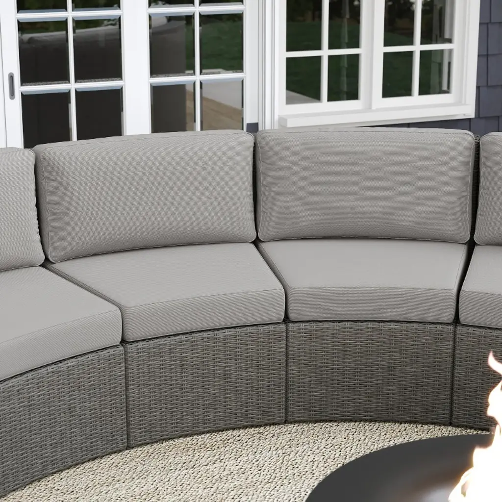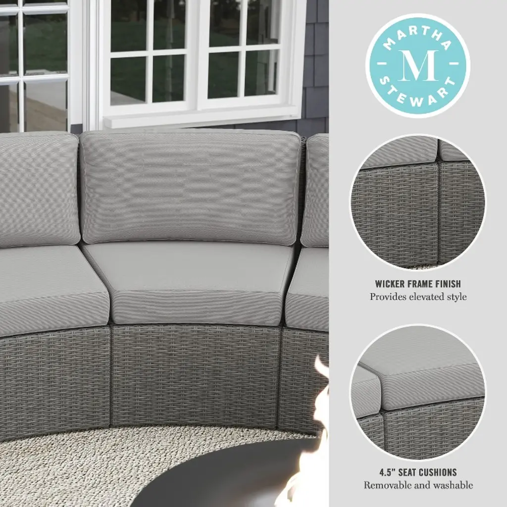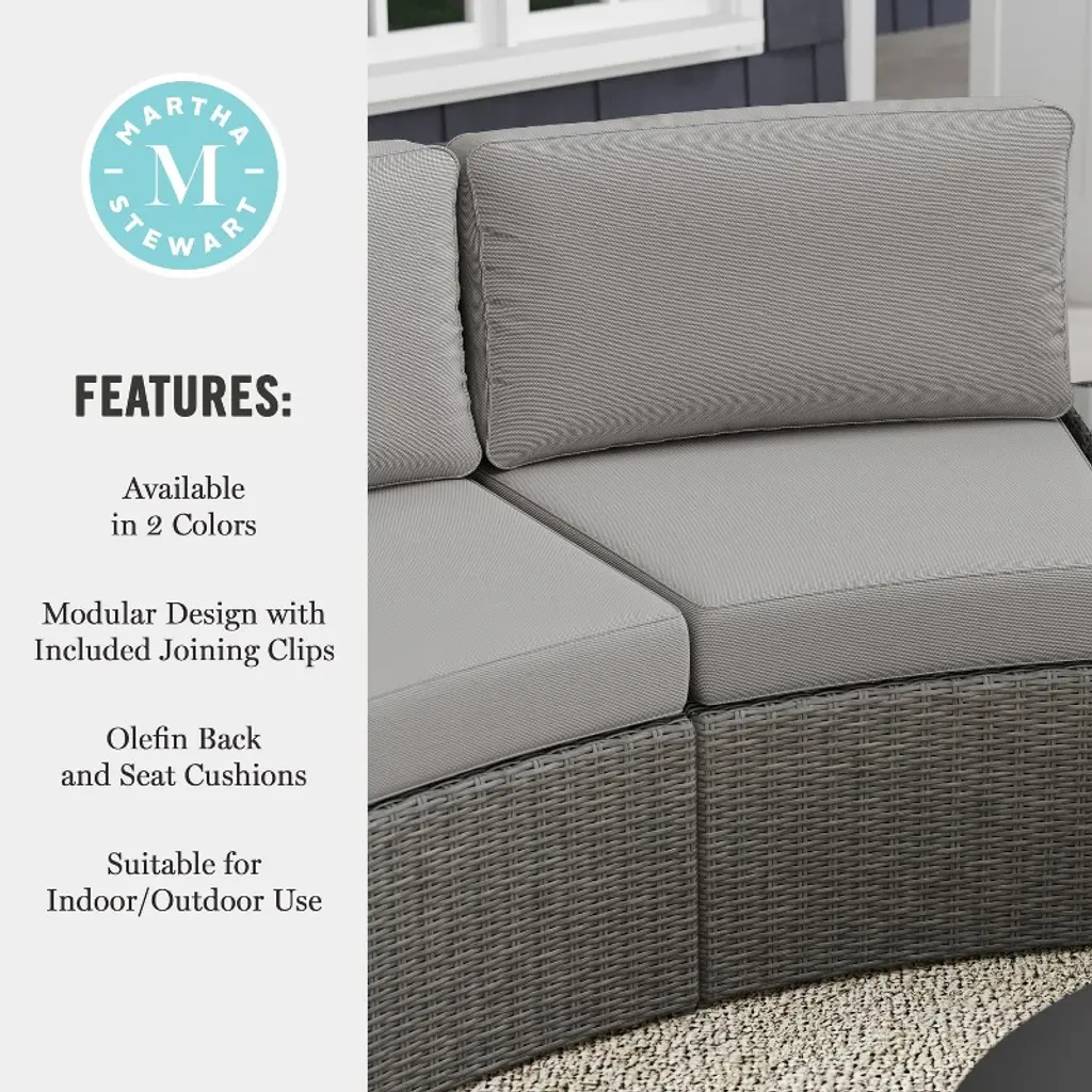 Refresh your patio space with the chic style and cozy comfort of this set of two Martha Stewart Bedford Modular Patio Curved Sectional Sofa Seats. Generously padded and sturdily built, these versatile patio seats are ideal for reading al fresco, enjoying cocktails with friends, or simply relaxing. Featuring 4.5” thick all-weather seat cushions and luxurious back cushions, these wicker seats will cradle you in comfort while you make the most of sunny days or starlit evenings. While suitable as a standalone set, you can purchase additional modular sectional pieces that secure easily with the included clips for a personalized configuration. Part of our Bedford collection, these seats pair wonderfully with the coordinating pieces allowing you to craft a custom collection that fits your indoor-outdoor needs. Setup consists of simply placing the cushions while upkeep is just as easy