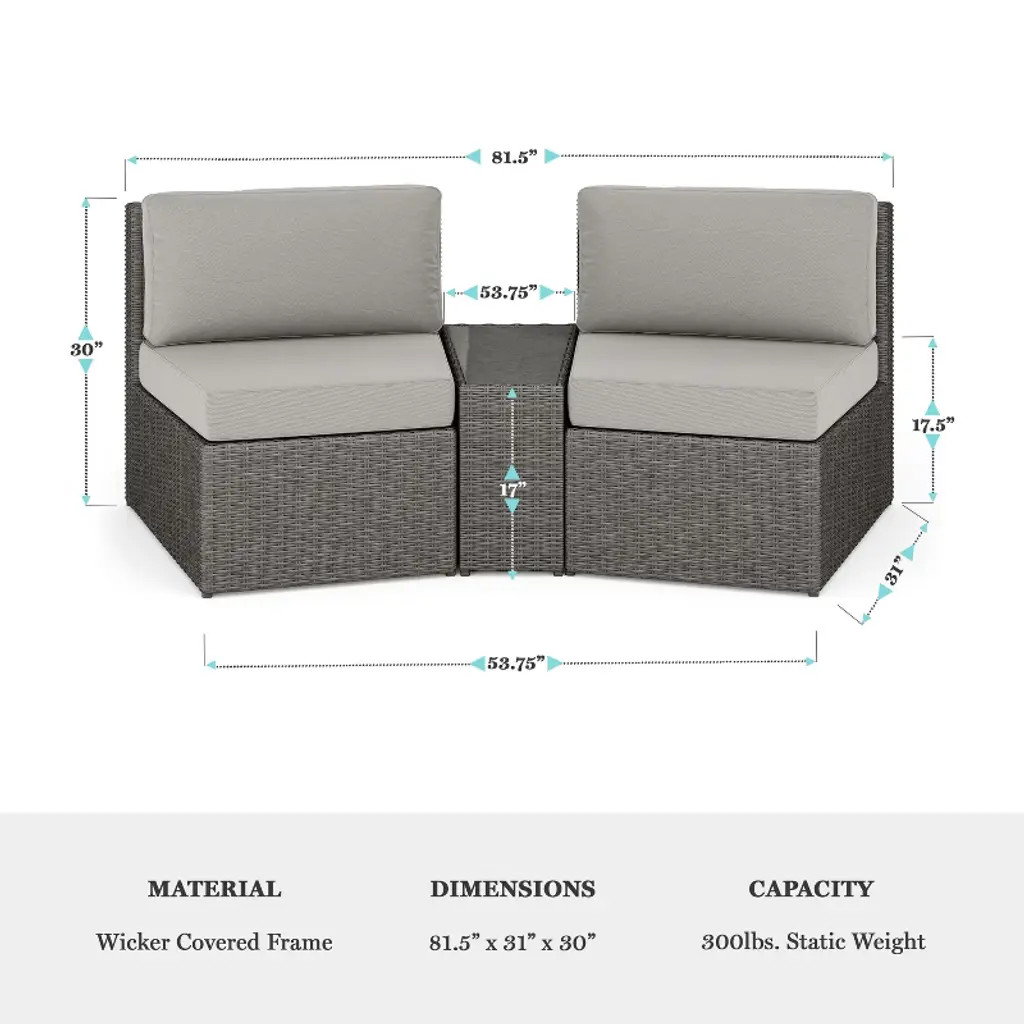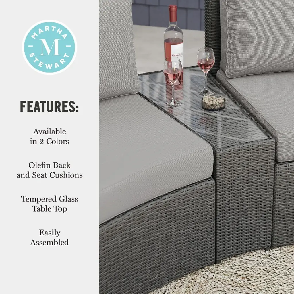 Refresh your patio space with the chic style and cozy comfort of this Martha Stewart Bedford 3 Piece Patio Set. Generously padded and sturdily built, two versatile patio seats and a side table are ideal for reading al fresco or enjoying cocktails with friends. Graced with 4.5” thick all-weather seat cushions and luxurious back cushions, the seats will cradle you in comfort while you make the most of sunny days or starlit evenings. The tapered table with an inset, tempered glass top, is ideal for drinks or decor. While suitable as standalone pieces, you can purchase additional modular sectional pieces that secure easily with the included clips for a personalized configuration. Part of our Bedford collection, this set pairs wonderfully with the coordinating pieces allowing you to craft a custom collection that fits your entertaining needs. Setup is simple with tools included and step-by-step instructions while upkeep is just as easy.