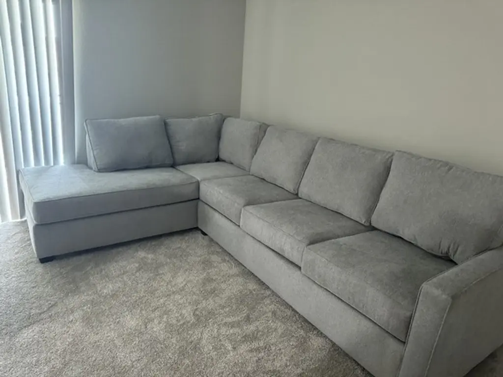 The Mathers Oyster Grey Fabric 125" 2 Piece L-Shaped Sectional with Left Arm Facing Corner Chaise offers a modern and sophisticated addition to your living room. Upholstered in grey fabric, this sectional features track arms and tapered legs, providing both comfort and style. The left arm facing corner chaise adds extra lounging space for ultimate relaxation.
