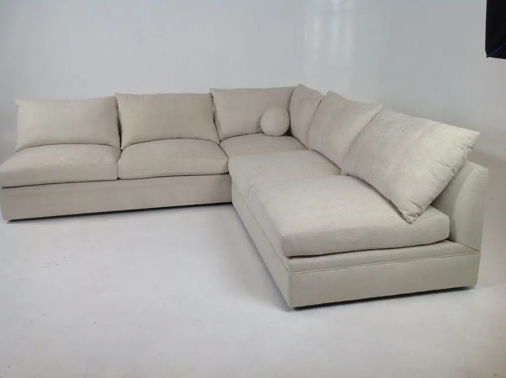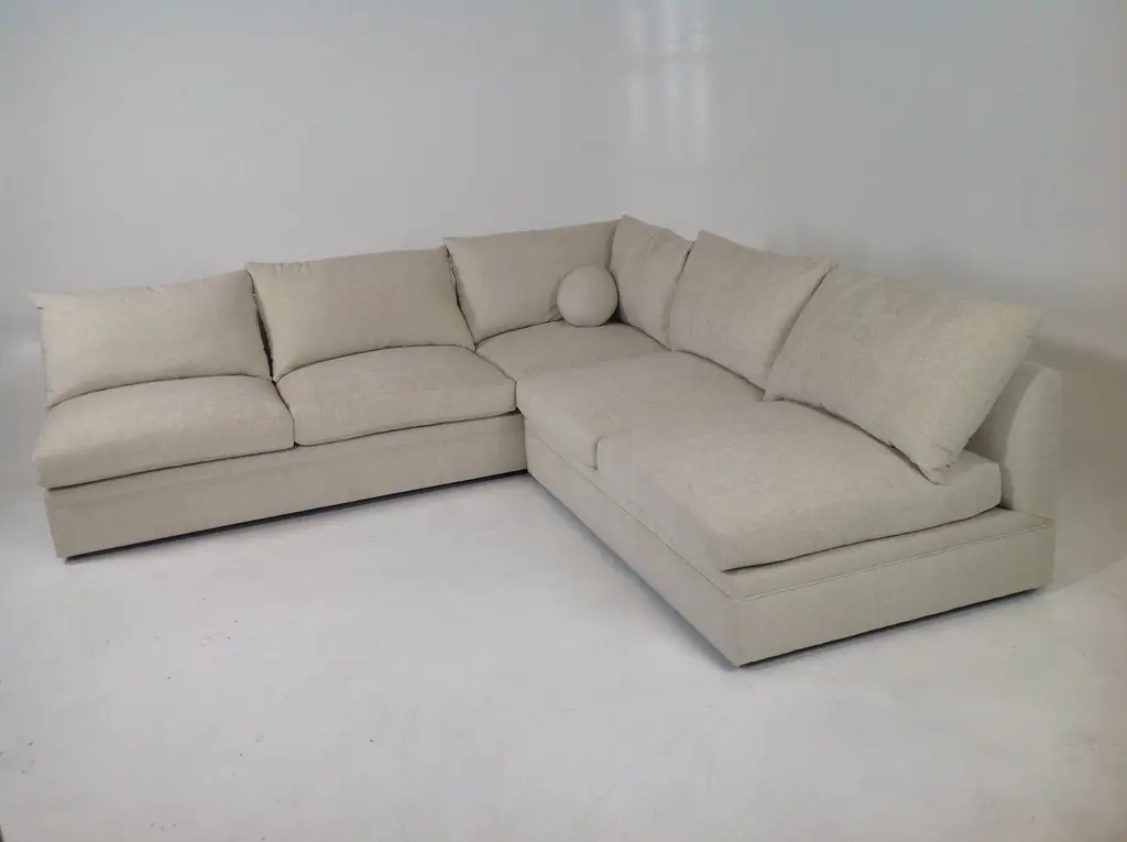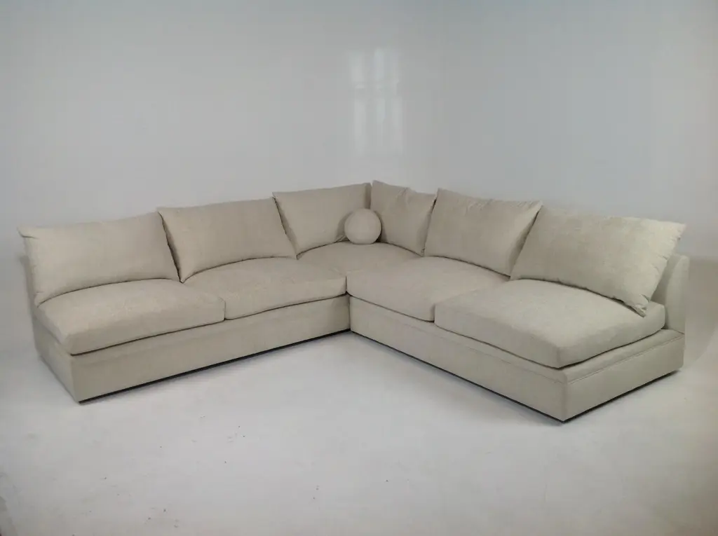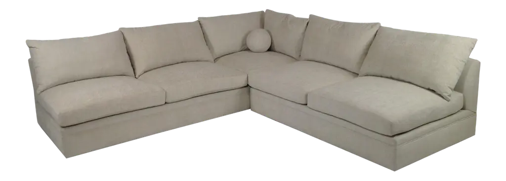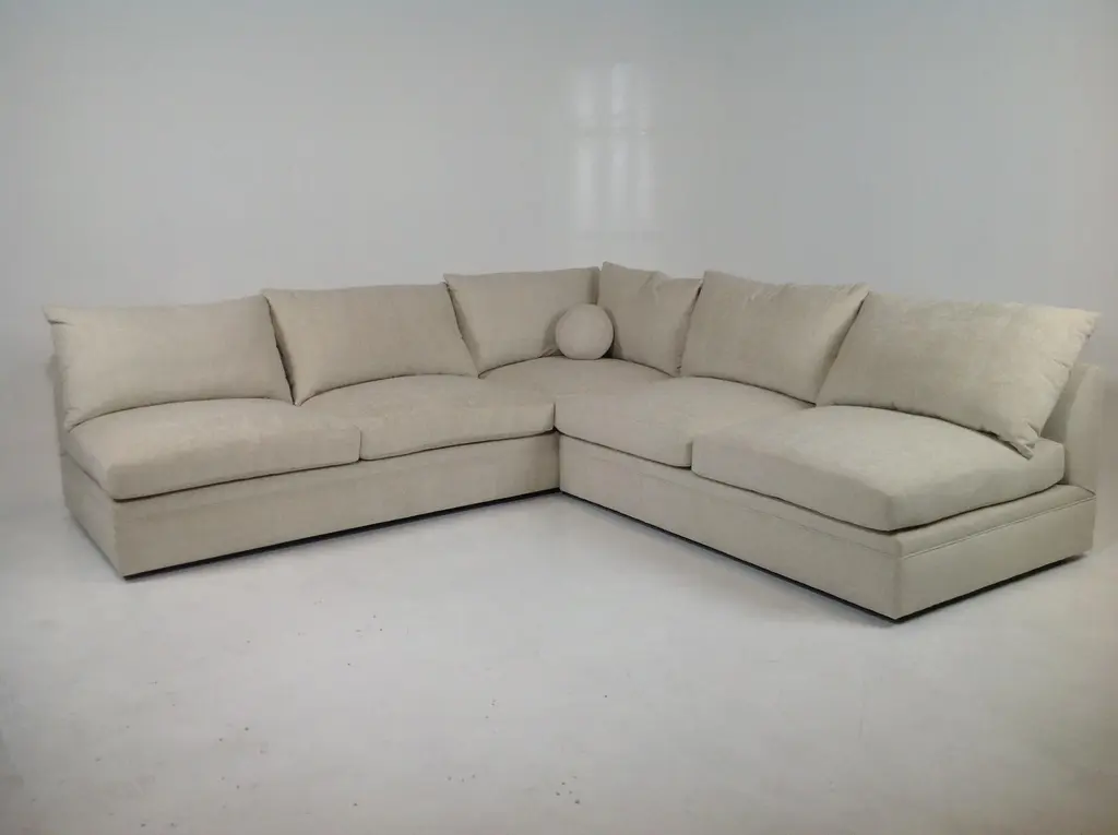 Modern mid century style sectional. The 2 piece sectional is armless and come together to form L Shape sectional. The fabric is a taupe chenille. The dims are 10’x10. Made of alder. Dims 120ʺW × 44ʺD × 34ʺH. More than 3 Decades of high-end furniture design and manufacturing experience. Unique pieces, perfect for a variety of spaces! Family owned and operated. Made in the USA.