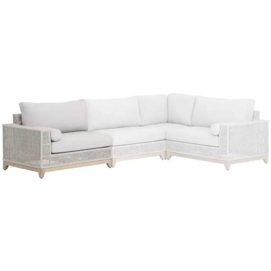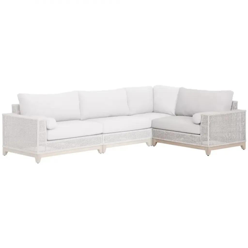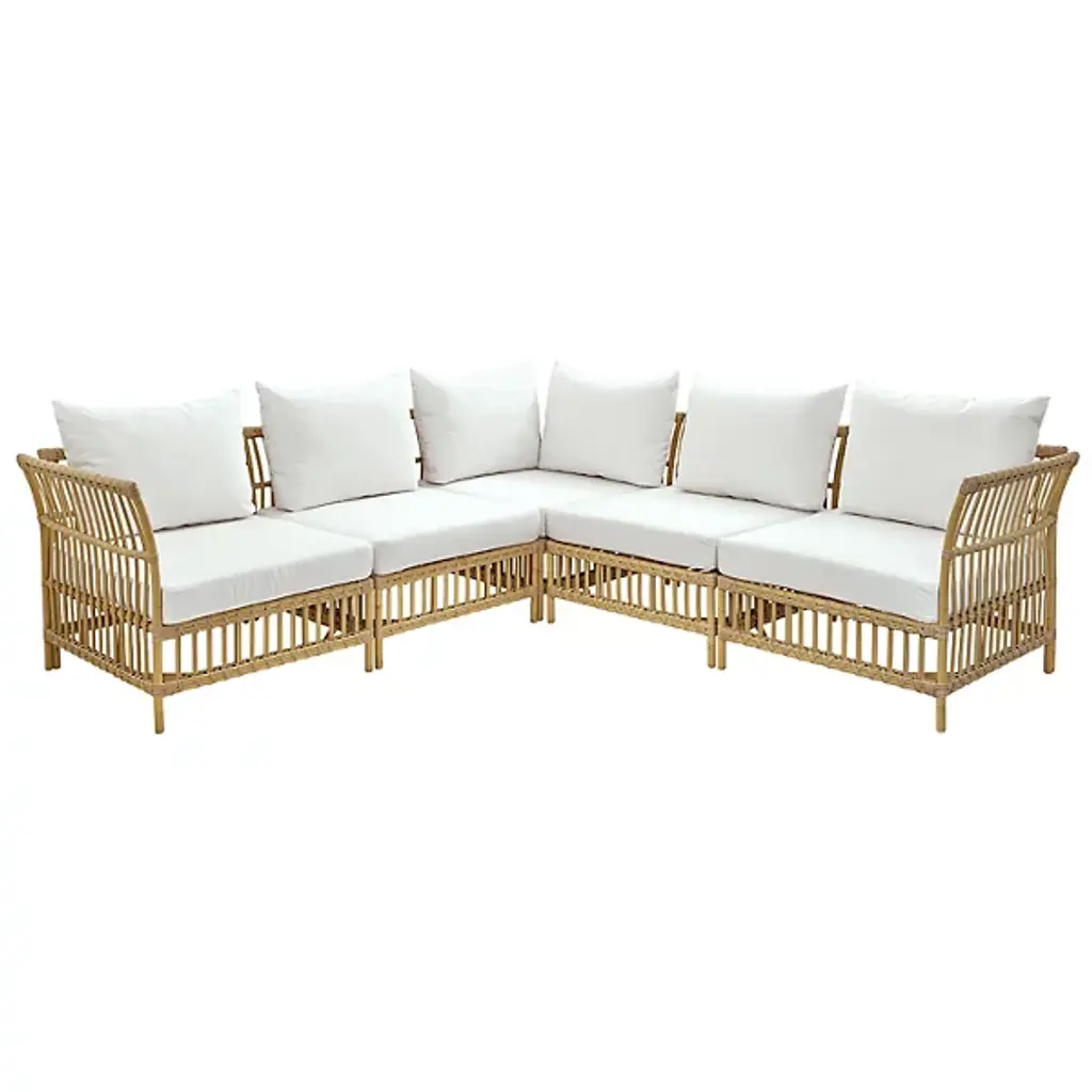 Designed for both style and comfort. Featuring sumptuous ivory cushions and a beautifully woven teak base, this sectional brings a touch of luxury to your patio or garden. Ships In 10-14 Business Days All-weather cushion All-weather woven wicker frame This image is for illustrative purposes only. The colors shown are accurate within the constraints of lighting, photography, and the color accuracy of your screen.