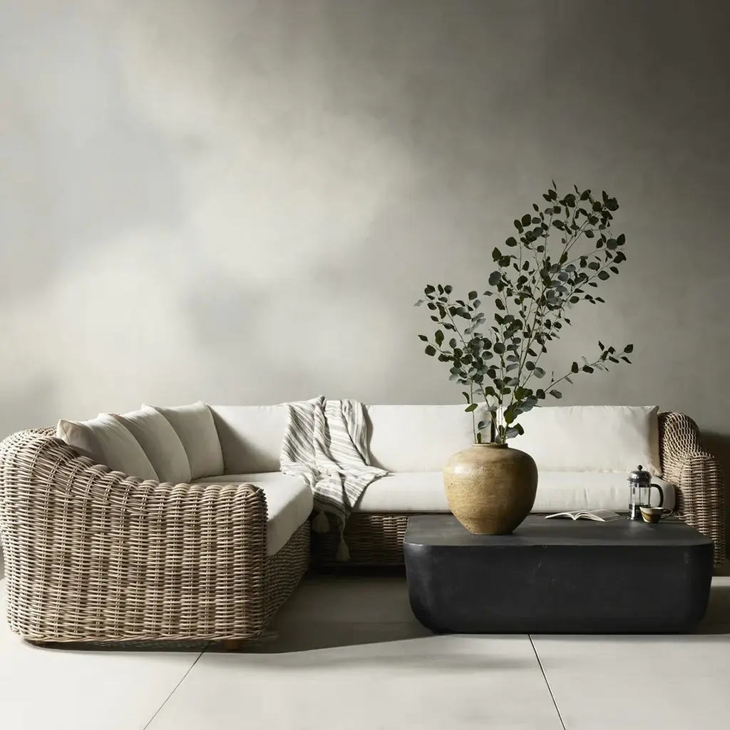 Designed for both style and comfort. Featuring sumptuous ivory cushions and a beautifully woven teak base, this sectional brings a touch of luxury to your patio or garden. Ships In 10-14 Business Days All-weather cushion All-weather woven wicker frame This image is for illustrative purposes only. The colors shown are accurate within the constraints of lighting, photography, and the color accuracy of your screen.