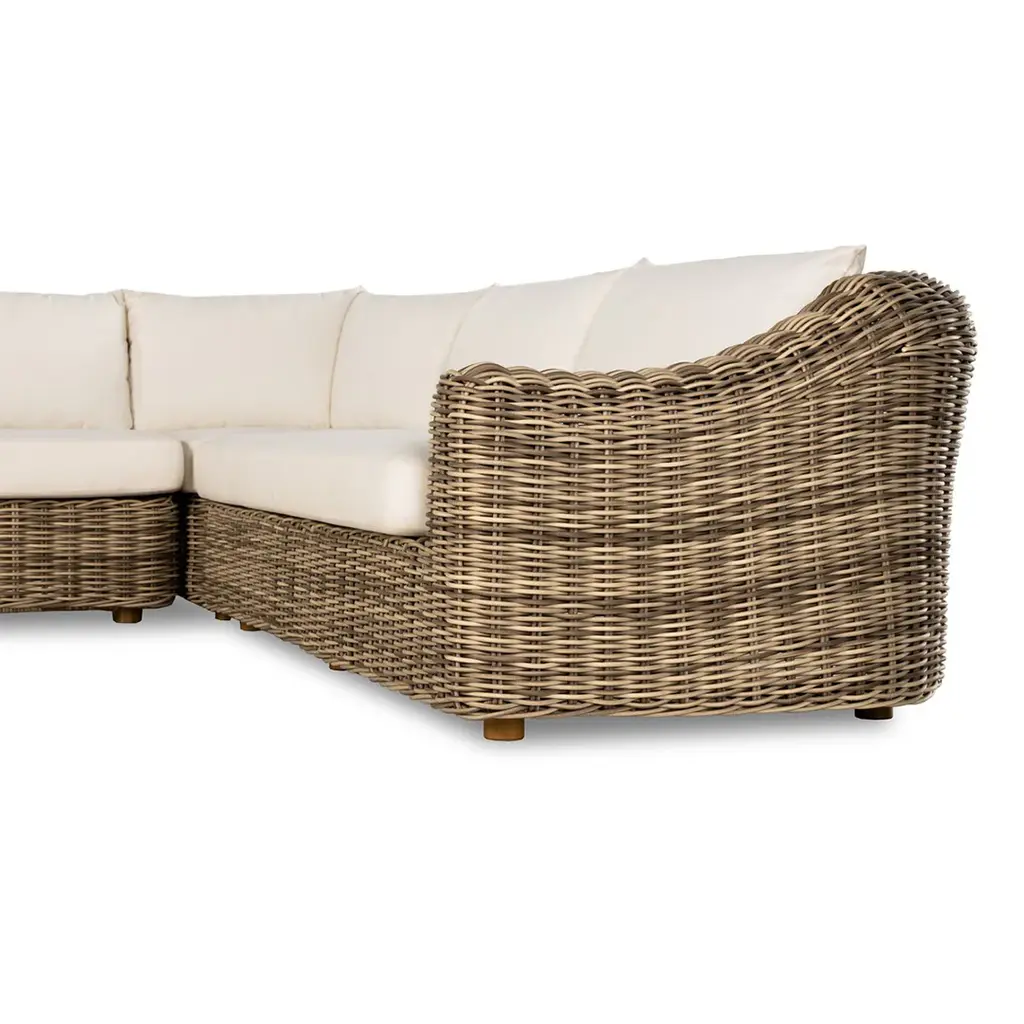Designed for both style and comfort. Featuring sumptuous ivory cushions and a beautifully woven teak base, this sectional brings a touch of luxury to your patio or garden. Ships In 10-14 Business Days All-weather cushion All-weather woven wicker frame This image is for illustrative purposes only. The colors shown are accurate within the constraints of lighting, photography, and the color accuracy of your screen.