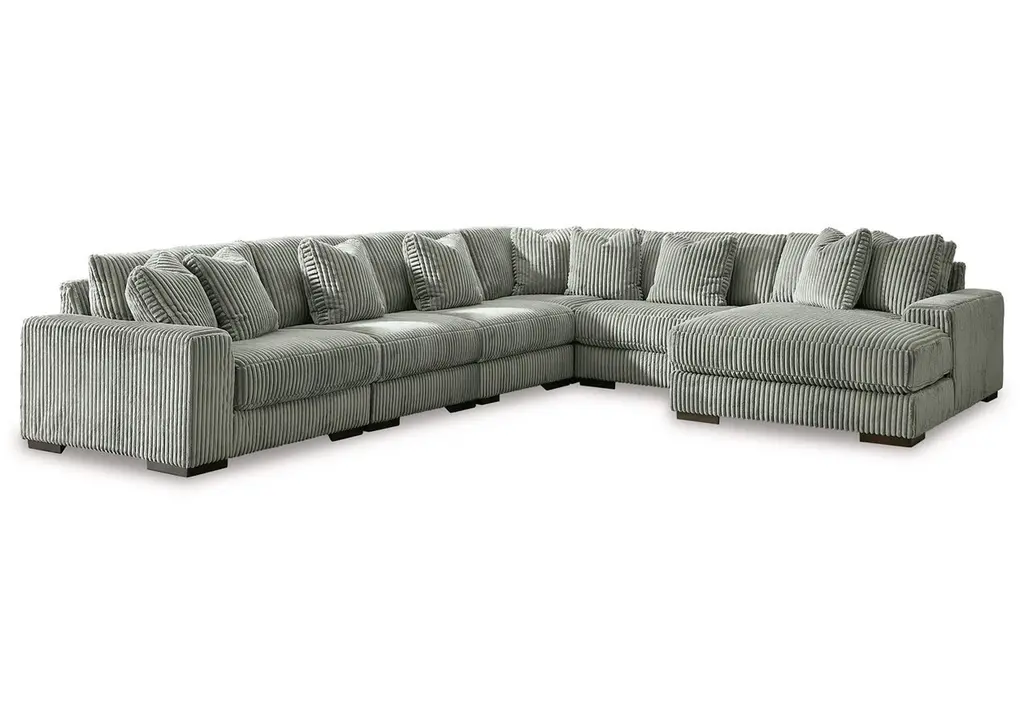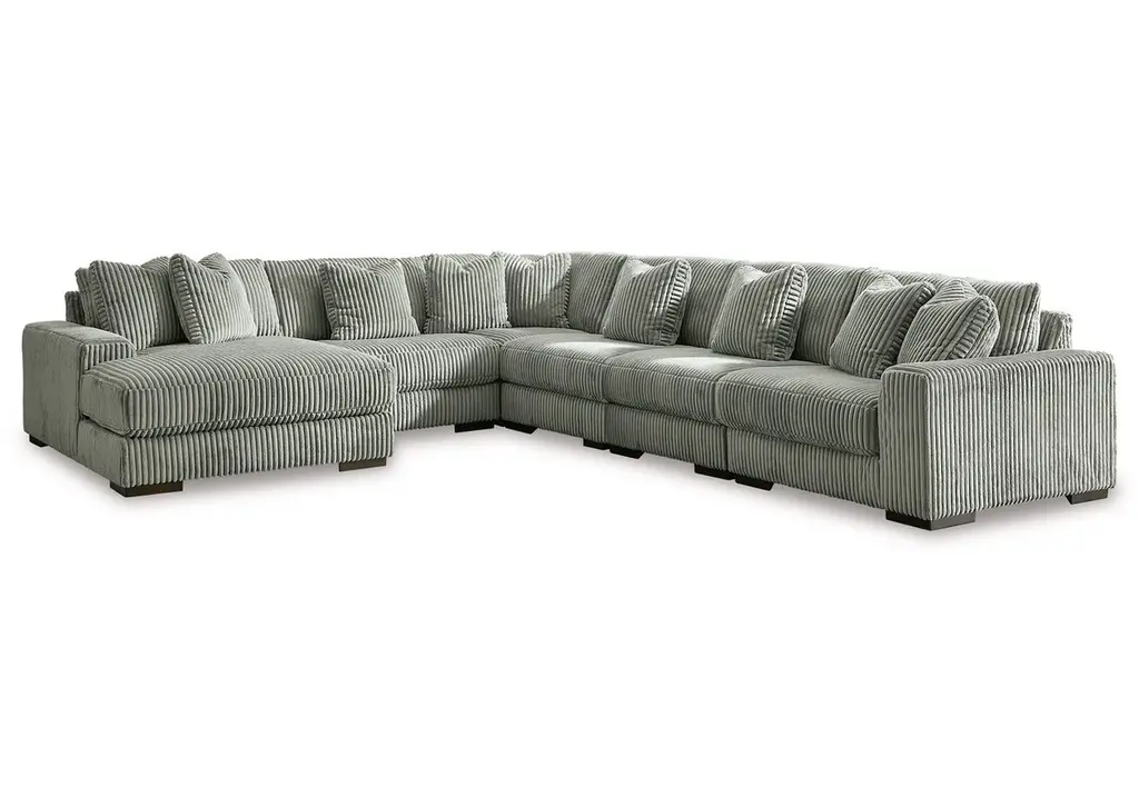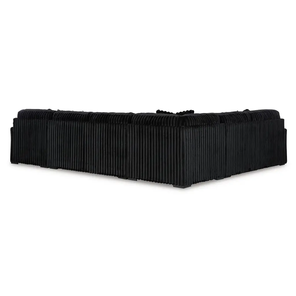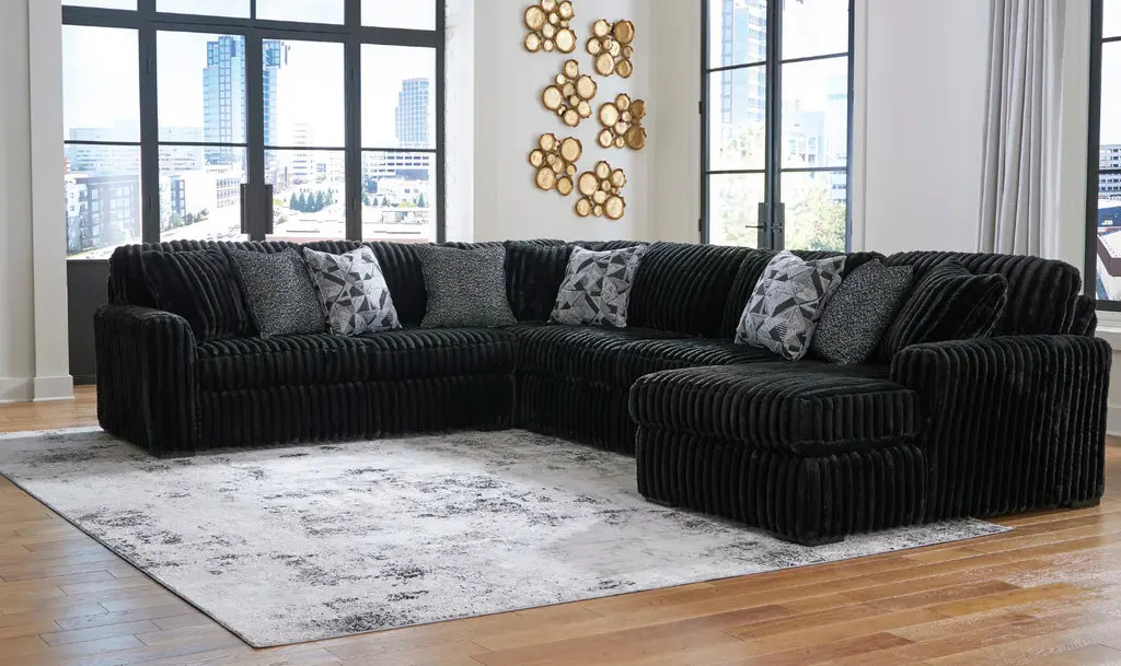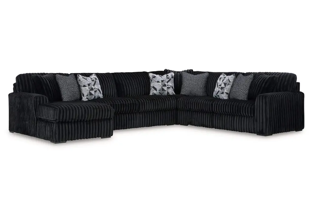 Sprawl out in comfort with the Midnight Madness 4 Piece Left Chaise Sectional. This roomy sectional features a left-facing chaise, thick corduroy upholstery, accent pillows, and a sag-resistant platform base. Perfect for movie nights, entertaining, or everyday lounging.