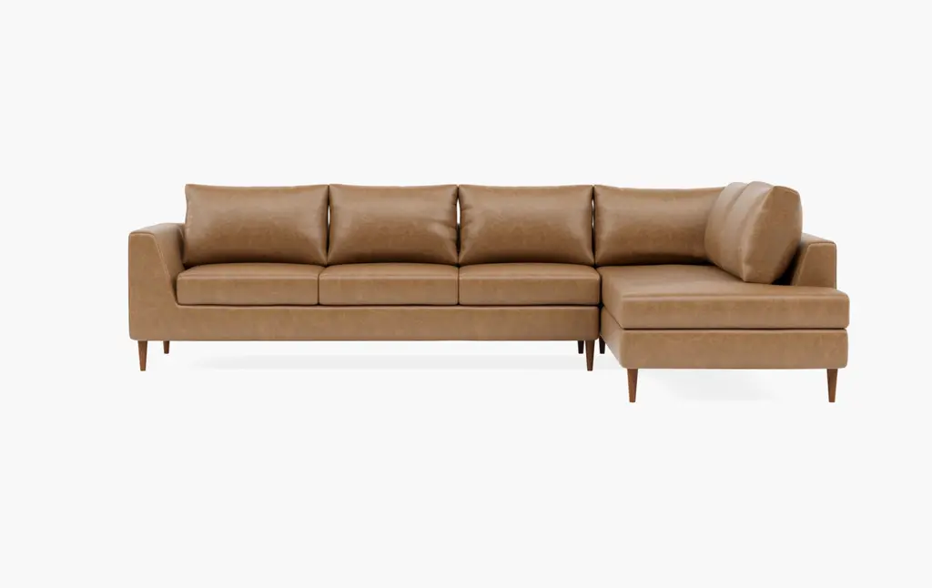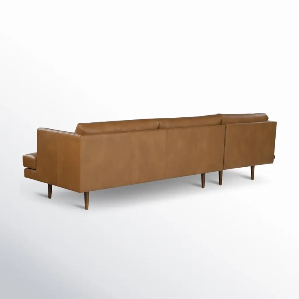 Drawing inspiration from modern Scandi design, this 2-piece sectional showcases a sleek silhouette accented by dowel legs + tapered track arms. It's built with a solid wood frame + wrapped in caramel-toned genuine leather for a vintage-inspired feel. Foam-filled cushions provide extra support as you lounge. Style this sectional with some bold patterned accent pillows.
