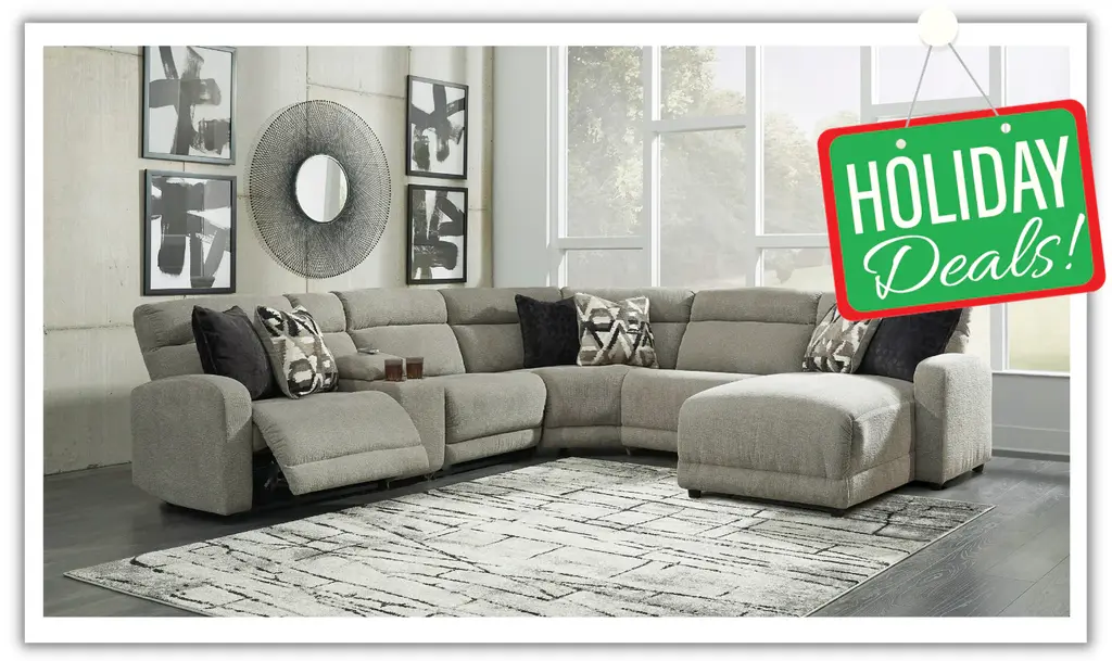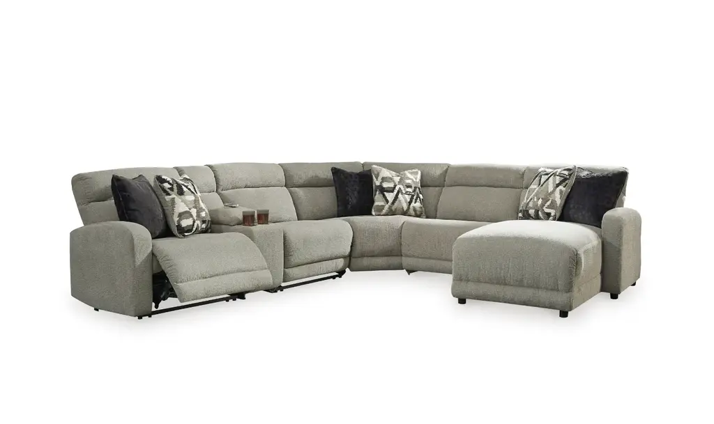 Elevate your living space with the Colleyville 6-Piece Power Reclining Sectional with Chaise – a modern marvel of comfort and style. This modular sectional is designed for the contemporary home, wrapped in a decadently plush stone-tone fabric that exudes neutral versatility. The clean-lined divided back, curved track arms, and low-profile back create a chic and relaxed aesthetic, making it the perfect addition to your living room. Enjoy the convenience of one-touch power controls with adjustable positions and a zero-draw USB plug-in, providing comfort and functionality. The "left-arm" and "right-arm" configurations seamlessly fit into your space. The sectional features a corner-blocked frame with metal-reinforced seats for durability, and the high-resiliency foam cushions wrapped in thick poly fiber offer exceptional comfort. Accent pillows are included to enhance the overall aesthetic, while the console with 2 cup holders and hidden storage adds practicality to the design. With zero-draw technology, the sectional consumes power only when the USB receptacle is used, making it an energy-efficient choice. Bring contemporary elegance and advanced functionality to your home with the Colleyville Power Reclining Sectional.Note:6 Pieces Includes -Left-arm facing zero wall power recliner, Armless power recliner, Armless chair, wedge, Right-arm facing power reclining back chaise and Console with storage