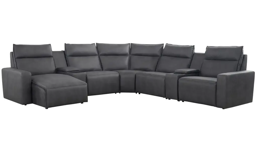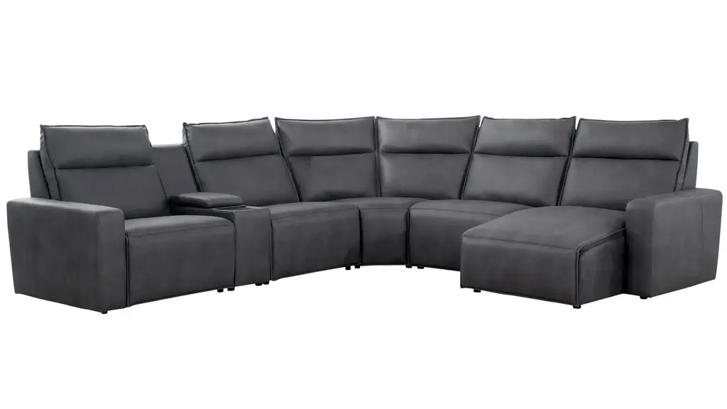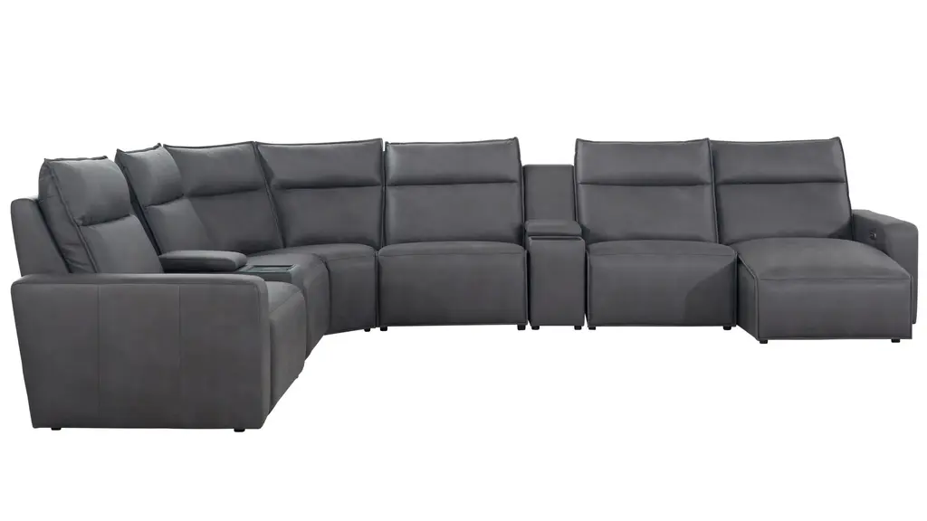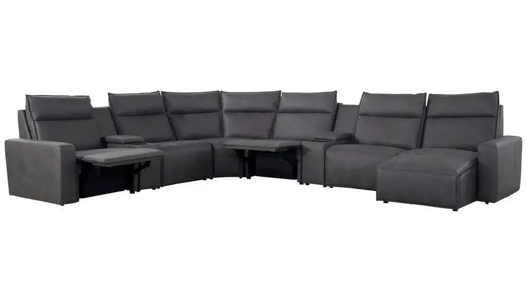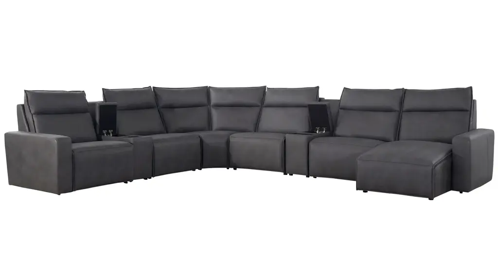 Ready to kick back, relax, and be fully immersed in comfort? The ModularTwo 8-pc. power sectional with power headrest is the seating solution you've been looking for. A celebration of contemporary style, the ModularTwo is upholstered in soft and stain-resistant microfiber faux leather. Track arms and a tailored pub back with flange-edged cushions bring a casual yet elevated aesthetic to your home. Designed with comfort and flexibility at the forefront, ModularTwo components are upholstered on all sides so you can rearrange and add to your personalized configuration as you please. You'll also love the tech features for your modern lifestyle: Power controls at your fingertips allow effortless reclining for the perfect position, and built-in Bluetooth speakers in the console let you stream music and movies for a truly immersive experience. Choose a preconfigured design or combine individual components to create modular seating that's perfect for your space and style.