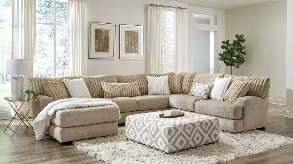 Lean into bold texture and blissful comfort with the faux fur chic of the Mondo 3-pc. sectional. Designed for visual impact and enduring seating comfort, the beige Mondo transforms your home into a haven of plushy elegance. Combine sectional pieces to create endless configurations to suit your home and lifestyle.