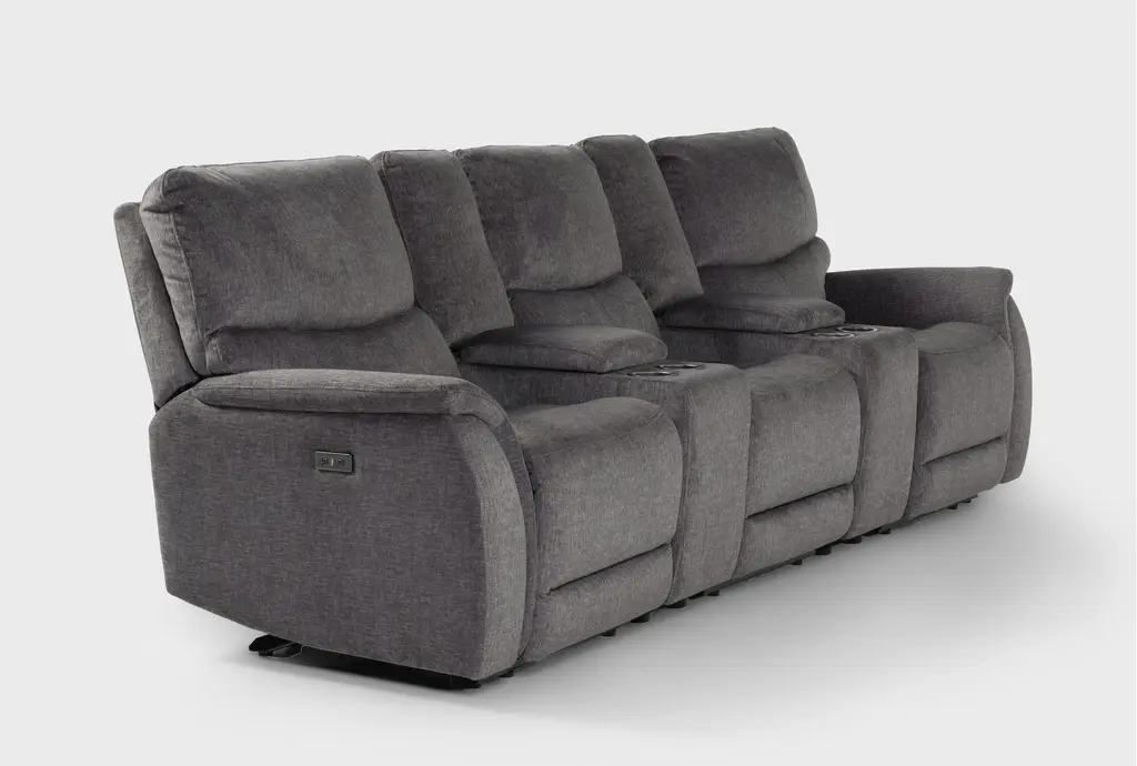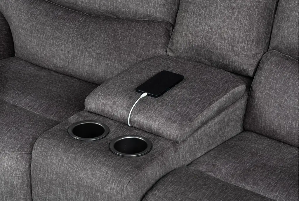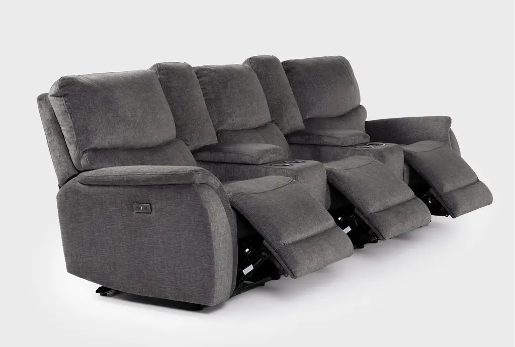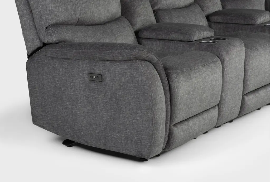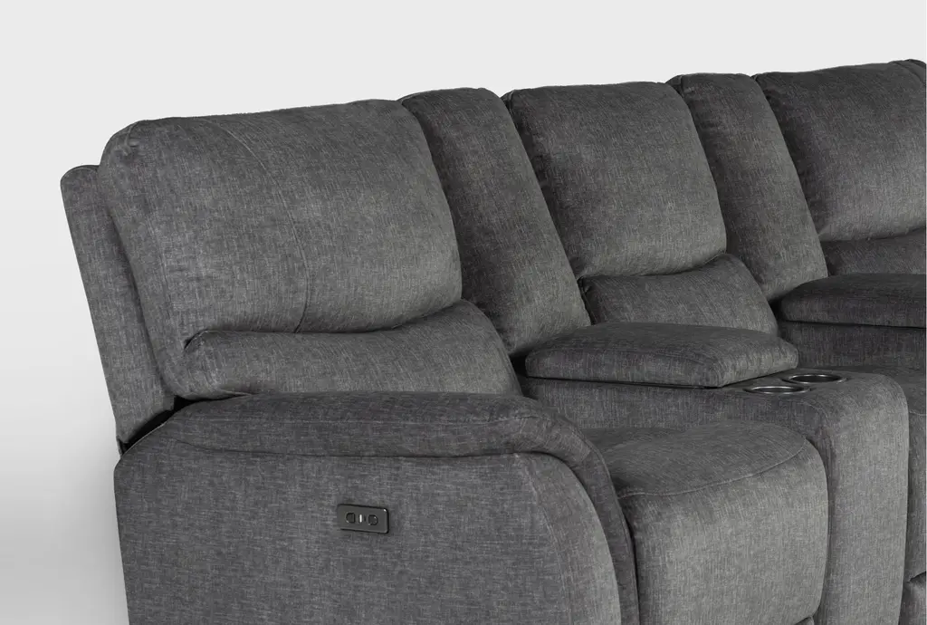 Experience ultimate comfort and style with the Nash 5 Piece 114" Power Reclining Modular Theater Sectional. This casual sectional is perfect for any living room, offering a sleek design in a sophisticated gunmetal color. The 100% polyester fabric ensures durability and a soft touch for long-lasting enjoyment.