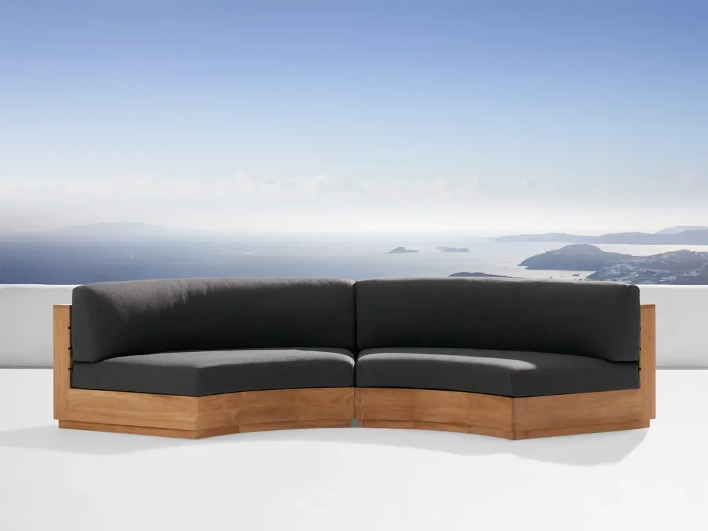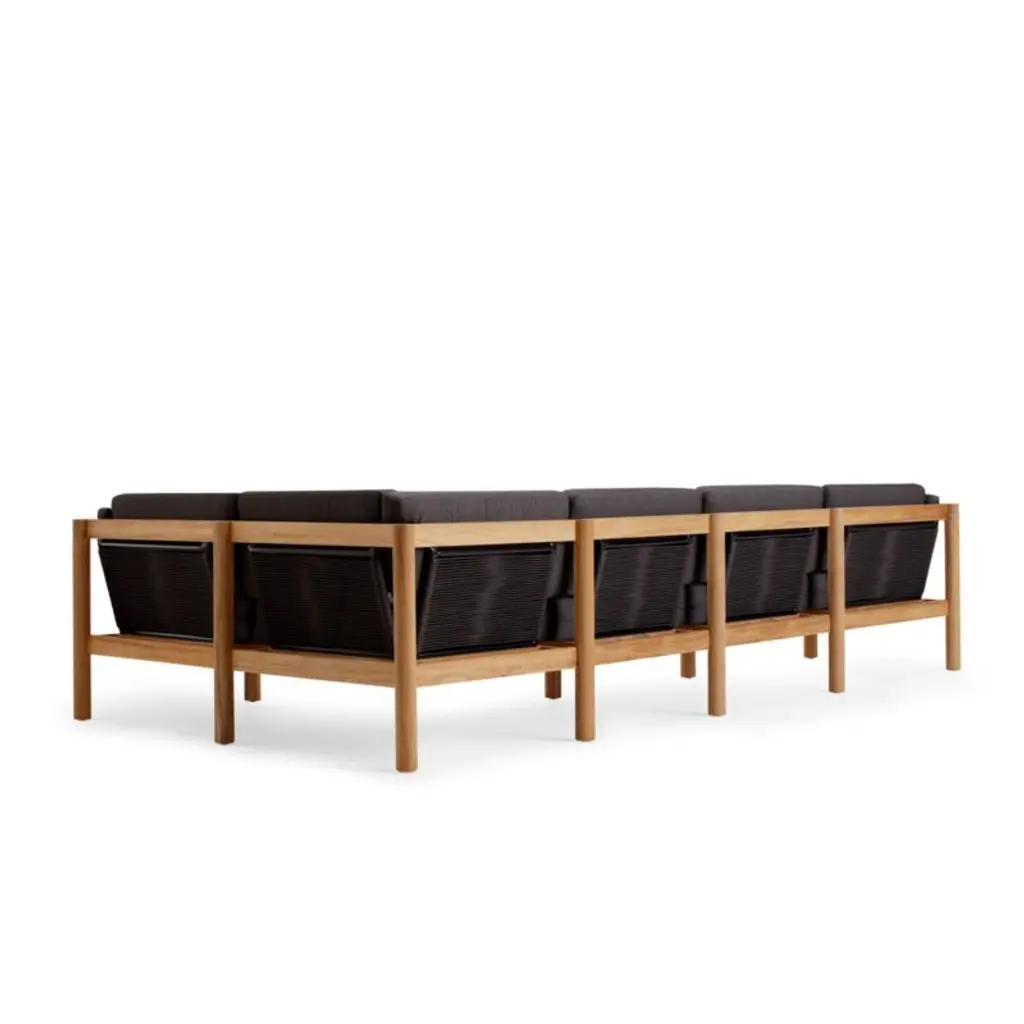 Space-saving yet deep-seated, this sectional sofa invites family and friends to kick back and enjoy the great outdoors. Boxy seat and back cushions upholstered in coal grey are curl-up comfy, while slim side bolsters add a soft layer for draping arms. Natural teak shapes the chunky, rounded frames complemented by hand-stretched polyester rope backs that angle slightly for a comfortable recline. Offering living-room looks with surprising durability, the U-shaped outdoor sectional withstands the elements in weather-resistant teak and fast-drying foam cushions.Based in Phoenix, Neighbor crafts beautiful, durable furniture for outdoor living with premium materials such as Sunbrella fabrics and FSC®-certified teak. We're thrilled to partner with Neighbor in bringing you Haven, one of the company's first collections designed to build connection and expand livable square footage to outdoor spaces.