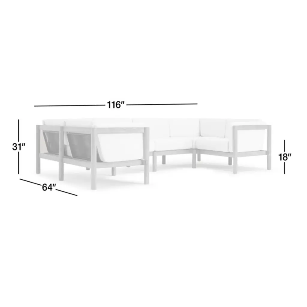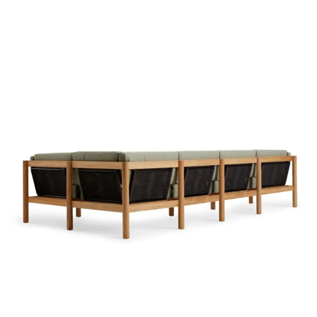 Space-saving yet deep-seated, this sectional sofa invites family and friends to kick back and enjoy the great outdoors. Boxy seat and back cushions upholstered in leafy green are curl-up comfy, while slim side bolsters add a soft layer for draping arms. Natural teak shapes the chunky, rounded frames complemented by hand-stretched polyester rope backs that angle slightly for a comfortable recline. Offering living-room looks with surprising durability, the U-shaped outdoor sectional withstands the elements in weather-resistant teak and fast-drying foam cushions.Based in Phoenix, Neighbor crafts beautiful, durable furniture for outdoor living with premium materials such as Sunbrella fabrics and FSC®-certified teak. We're thrilled to partner with Neighbor in bringing you Haven, one of the company's first collections designed to build connection and expand livable square footage to outdoor spaces.