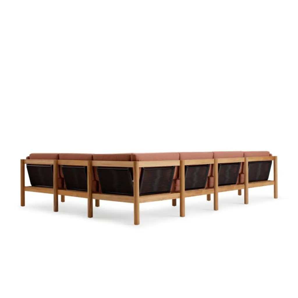 Space-saving yet deep-seated, this sectional sofa invites family and friends to kick back and enjoy the great outdoors. Boxy seat and back cushions upholstered in warm rust are curl-up comfy, while slim side bolsters add a soft layer for draping arms. Natural teak shapes the chunky, rounded frames complemented by hand-stretched polyester rope backs that angle slightly for a comfortable recline. Offering living-room looks with surprising durability, the U-shaped outdoor sectional withstands the elements in weather-resistant teak and fast-drying foam cushions.Based in Phoenix, Neighbor crafts beautiful, durable furniture for outdoor living with premium materials such as Sunbrella fabrics and FSC®-certified teak. We're thrilled to partner with Neighbor in bringing you Haven, one of the company's first collections designed to build connection and expand livable square footage to outdoor spaces.