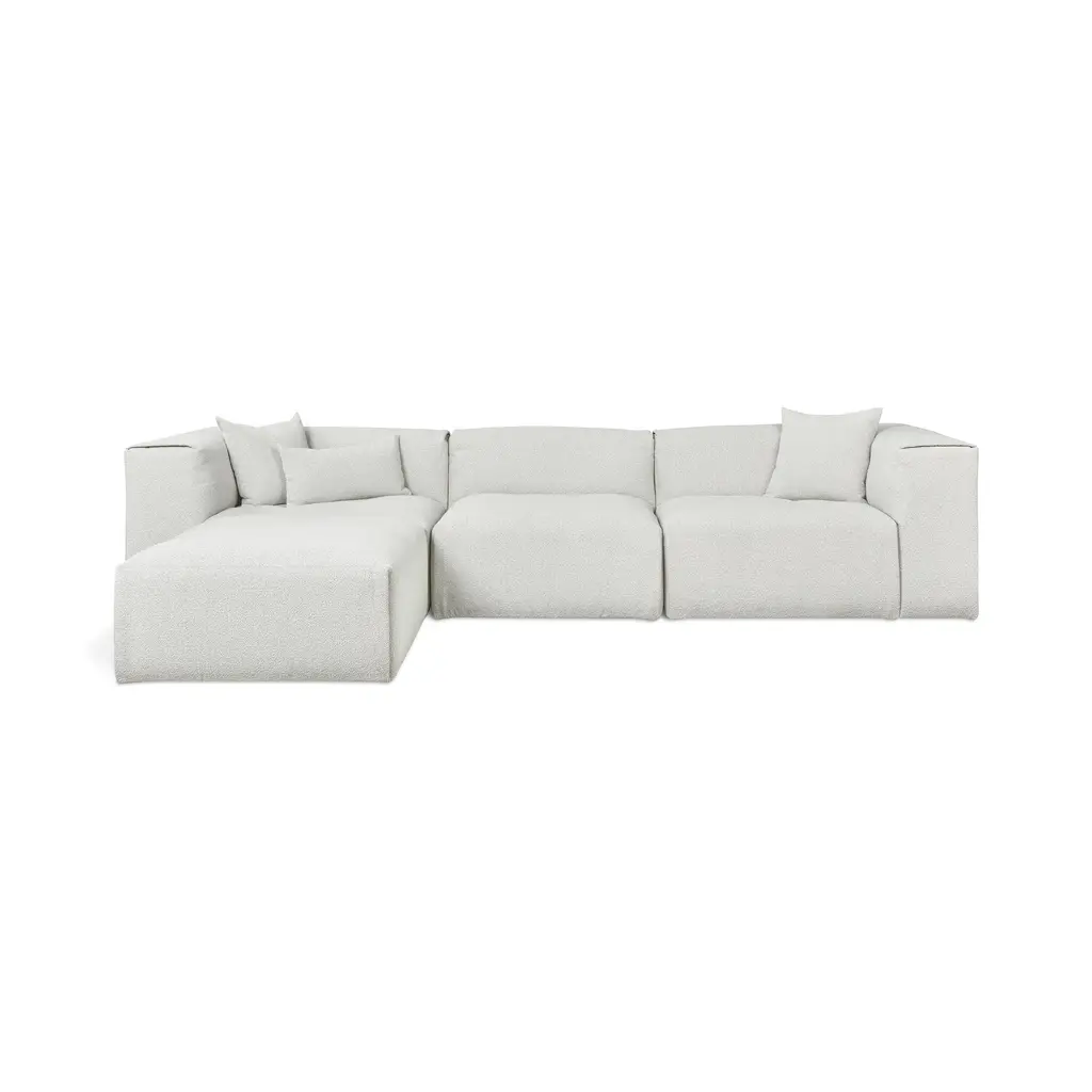 Indulge in the ultimate luxury lounging experience with the Nest Modular 4-piece Sectional from Gus. Featuring plush comfort, a sleek design, and endless configurations, this collection adapts to your evolving lifestyle. The premium feather fill and nubby bouclé fabric add a touch of sophistication, making it perfect for any setting, from a beach house to a boutique hotel lobby. Highlights