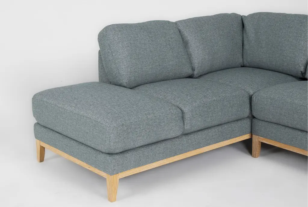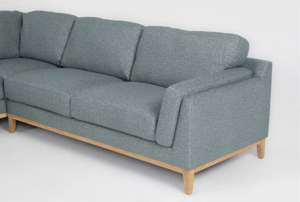 Transform your living room with the Newport Seafoam Blue Fabric 111" 2 Piece L-Shaped Sectional With Left Arm Facing Corner Chaise. Featuring a modern design, this sectional is upholstered in midnight jade fabric and supported by light wood legs, offering both style and comfort.