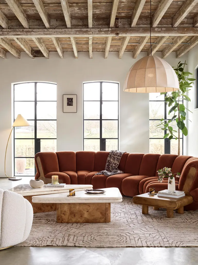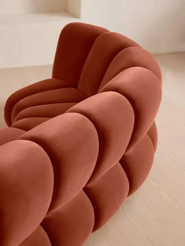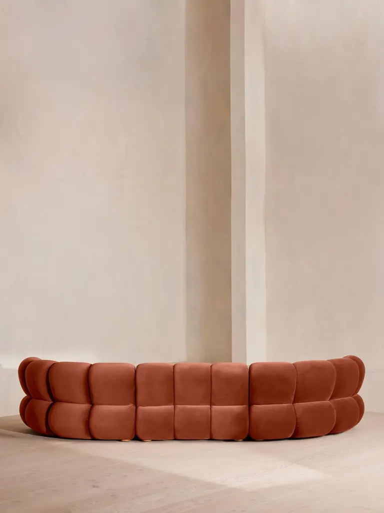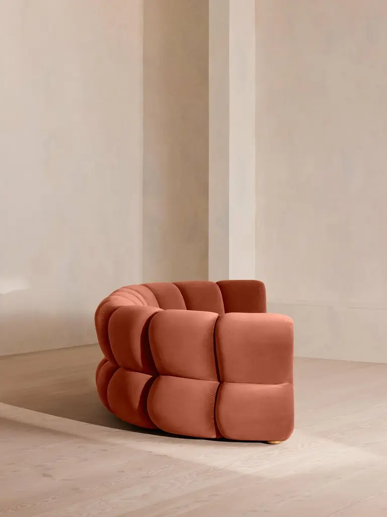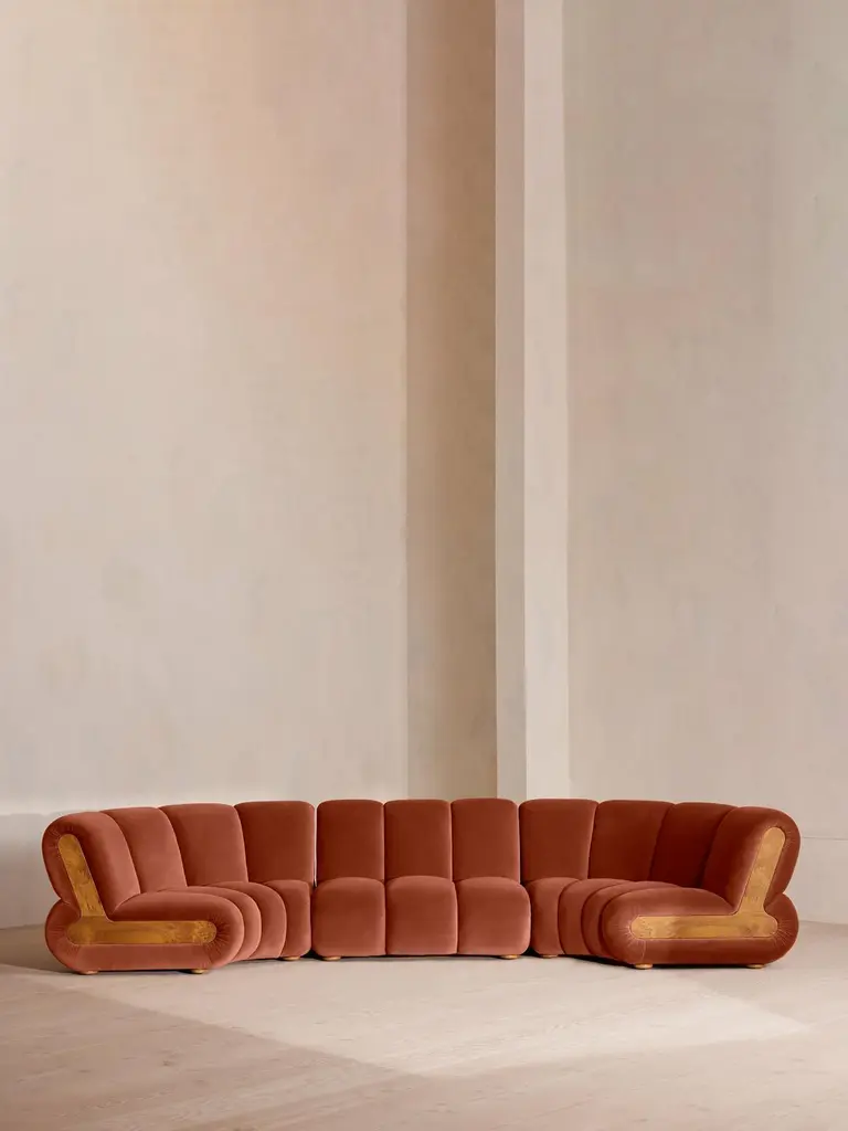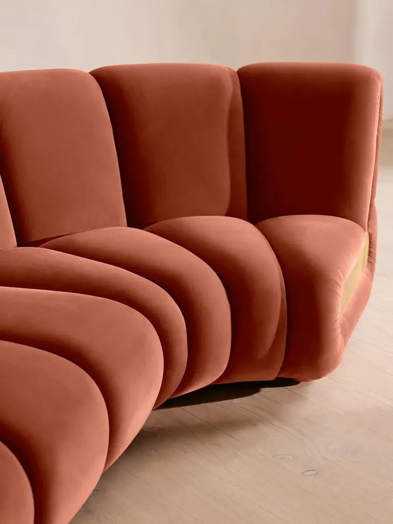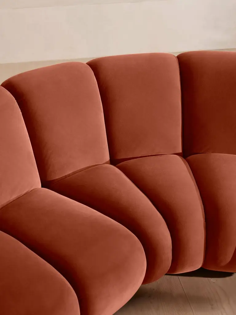 Designed to adapt to any living space, the Noelle modular sofa comprises of straight and curved modules to create the shape you desire, or alternatively a generous armchair if used alone. Rich velvet upholstery is complemented with aged Pippy Oak veneer sides that have a burl finish, while its statement curved shape takes its design cues from the 1970s interiors of 180 House. Six seater curved sofa Cotton velvet upholstery Aged Pippy Oak veneer Burl finish Inspired by 180 House