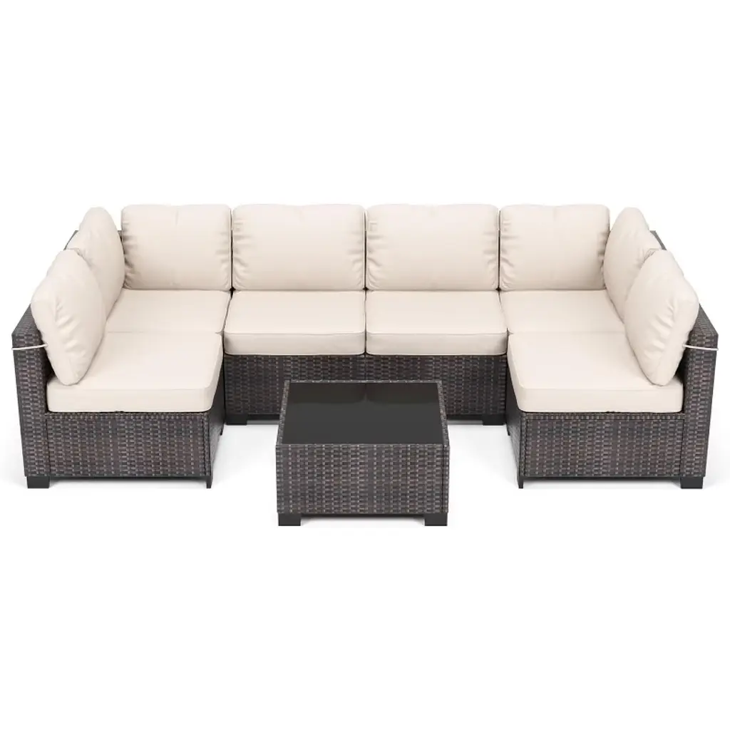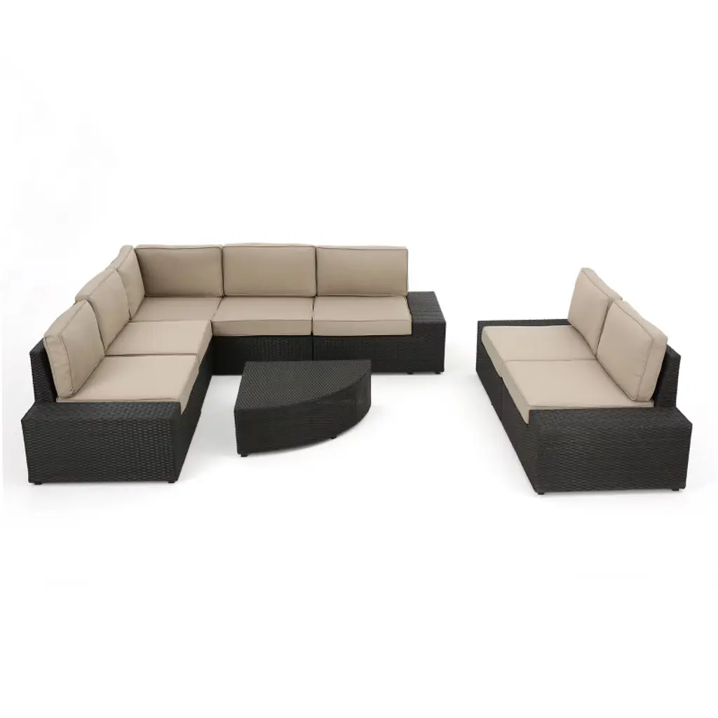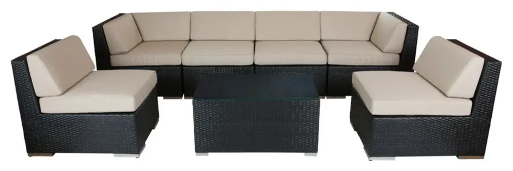 Lounge in the sun after taking a dip, or rest after tending to the grill with the Ohana Beach 7-Piece Outdoor Sectional Set. This comprehensive set features modular pieces for rearranging, including two corner chairs, four armless chairs and a coffee table. Each piece is made from black resin wicker with padded cushions upholstered in weather-resistant Sunbrella fabric. Great for summer parties, barbecues or even just relaxing in the sun, this set is both comfortable and stylish.7-piece outdoor setSet includes 2 corner chairs, 4 armless chairs and 1 coffee tableStainless steel feetRust-free aluminium frameWeatherproof PE resin wickerRemovable sunbrella cushion coversInclined chair backs for optimum comfortConfigurable modular setNo assembly requiredColor: Black wicker with beige cushionsMaterials: PE resin wicker, aluminum and Sunbrella fabricCorner chairs: W 32" x D 32" x H 28"Armless chairs: W 26.5" x D 32" x H 28"Coffee table: W 31.5" x D 19.7" x H 16.5"