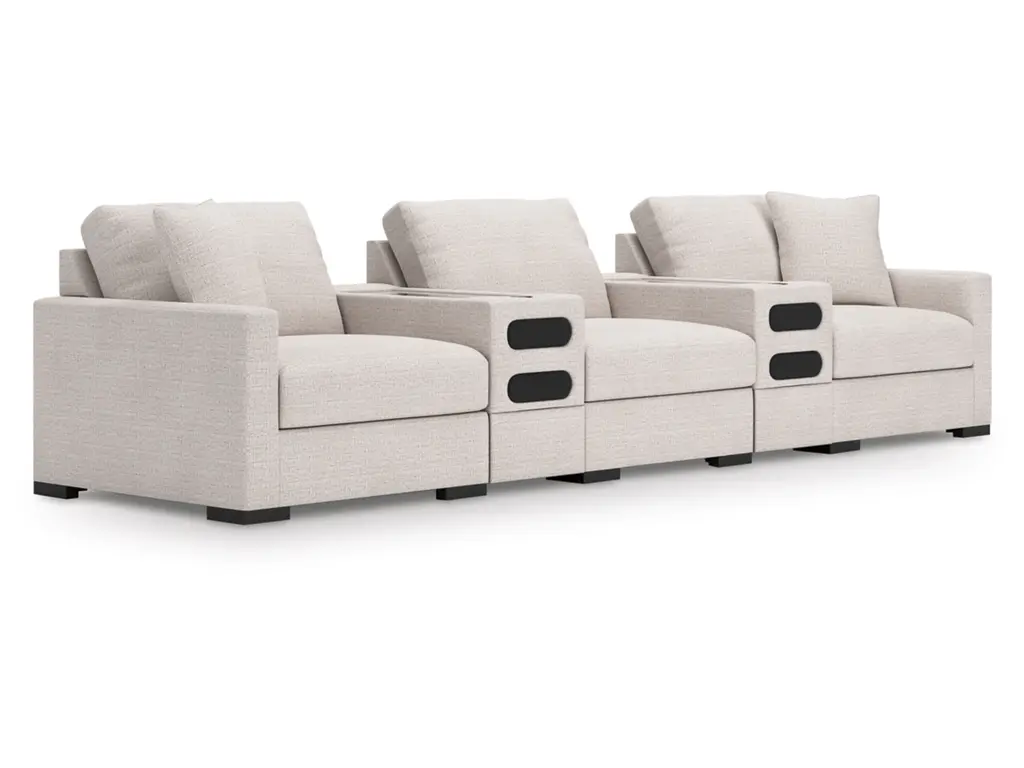 The Omaha by Ashley sectional with audio evolves as your family’s needs do. Its adaptable modular design makes staging and rearranging a breeze. Living room messes leaving you stressed? Cleaning is that much easier with stain-resistant and durable Next-Gen Nuvella™ fabric. Storage consoles with built-in audio systems give family movie nights or gaming with friends an immersive upgrade. Complete with USB charging, this sectional brings fashionable function to everyday lounging.