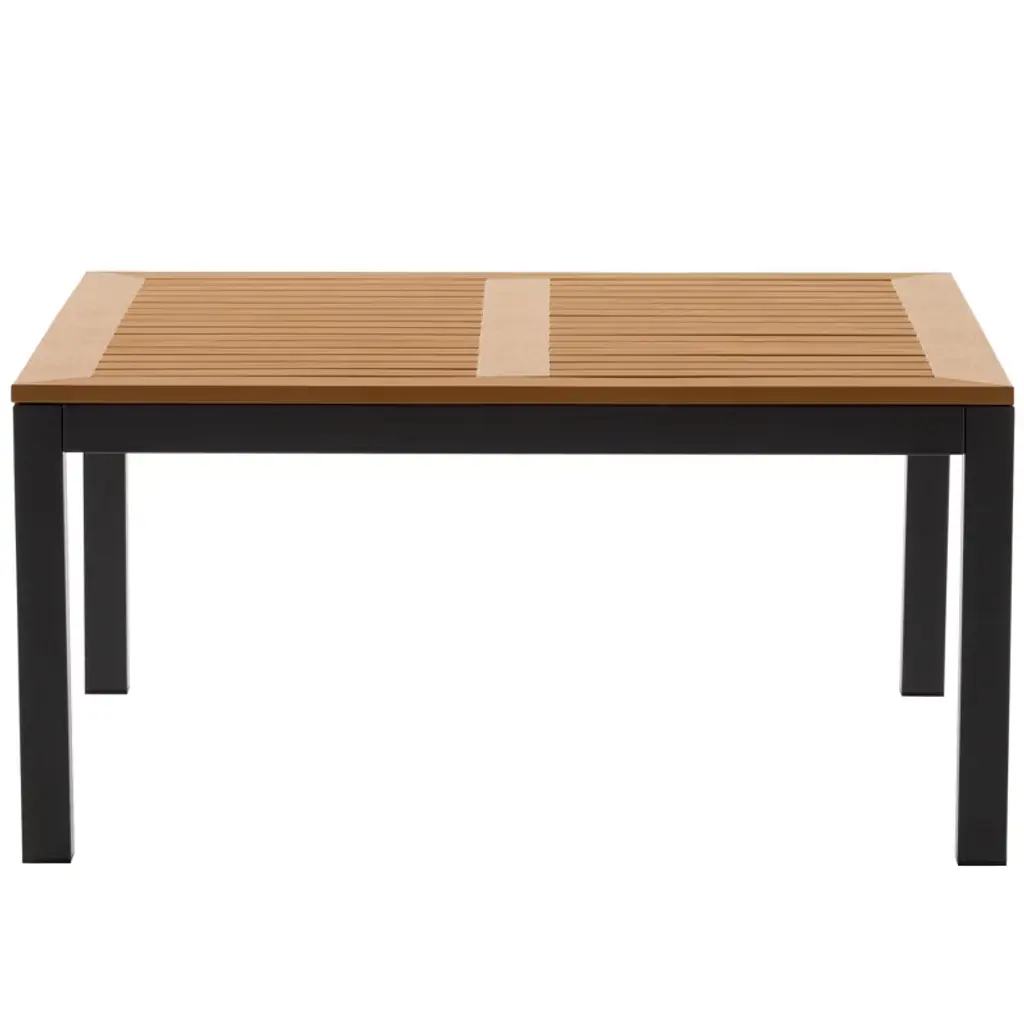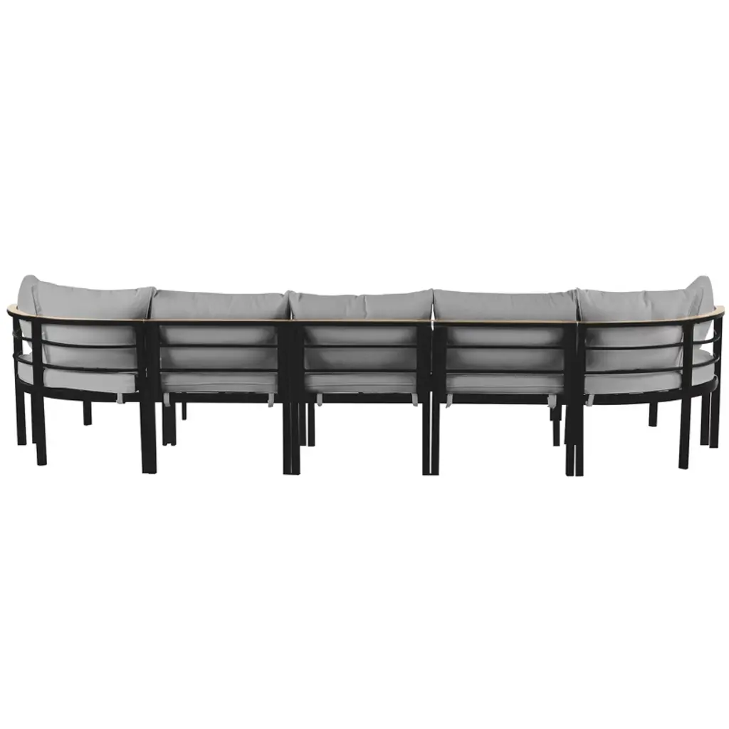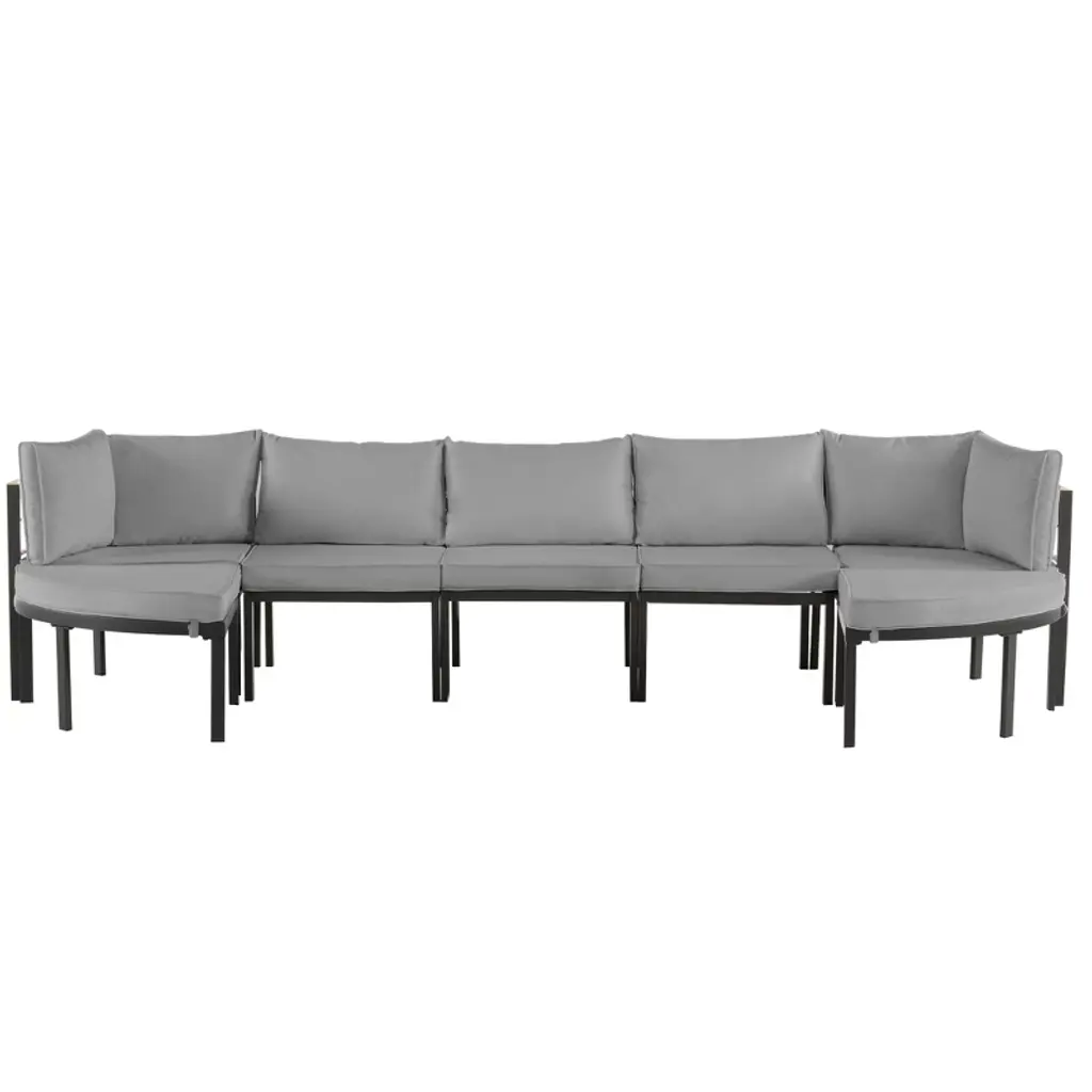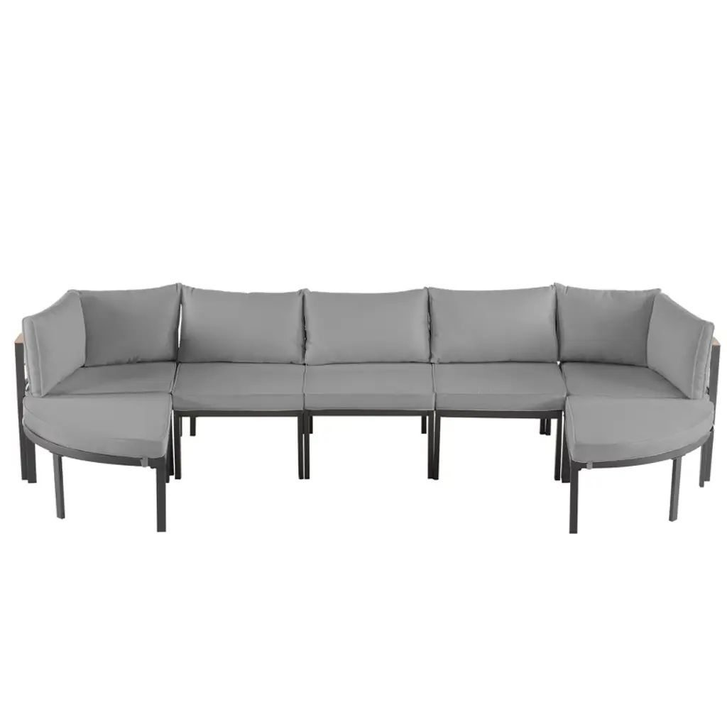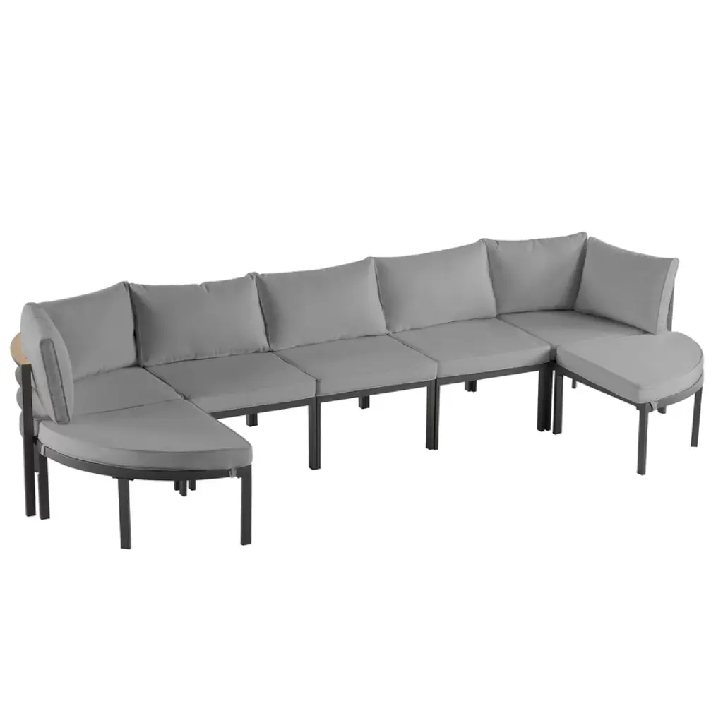 Modular Outdoor Patio Sofa Set with Functional Coffee Table & Ottoman This stylish and functional outdoor sofa set is designed to offer comfort and versatility for your outdoor space. Featuring a modular sectional layout, a multi-purpose ottoman, and a waterproof coffee table, this set provides ample seating and functionality for gatherings or relaxing moments. The sturdy iron frame ensures durability, while the high-density foam cushions offer a cozy seating experience for extended use. Perfect for patios, gardens, and decks, this set enhances your outdoor aesthetics with a modern and elegant design. Product Features: Modular & Spacious Seating Arrangement: The U-shaped sectional design offers flexible seating options, allowing you to customize the layout to fit your outdoor space. It provides ample seating for family and guests, making it perfect for gatherings or quiet evenings.Functional Coffee Table & Multi-Purpose Ottoman: The sleek coffee table features a WPC slatted surface that is water-resistant, perfect for drinks and snacks. The square ottoman serves as extra seating, a footrest, or even a side table, adding versatility to the setup.Sturdy Iron Frame: The robust iron frame provides excellent stability and durability. The rust-resistant coating ensures long-lasting performance, making it ideal for all-season outdoor use.Waterproof & Comfortable Cushions: Filled with high-density foam, the cushions offer superior comfort. The cushion covers are made from waterproof fabric, providing protection against spills and light rain, while ensuring easy maintenance.Ergonomic Design for Maximum Comfort: Designed with a well-proportioned seat depth, thick cushions, and a supportive backrest, this set ensures comfort. The slightly curved armrests and corner seating contribute to its inviting feel.Elegant Outdoor Aesthetic: Featuring a modern black metal frame, neutral-tone cushions, and natural wood-like tabletops, this set complements a variety of outdoor settings, enhancing your space with a sleek, contemporary look. Product Details: Overall Dimensions: Sectional Sofa: 126"D x 27.6"W x 26"HOttoman Dimensions: 17.3"D x 17.3"W x 21.3"HCoffee Table Dimensions: 31.5"D x 31.5"W x 15.3"HCushion Thickness: 3.9 inchesWeight Capacity: Sectional Sofa: 250 lbs per seat, Ottoman: 250 lbs, Coffee Table: 400 lbsProduct Weight: Total: 173.51 lbs (Sectional Sofa: 134.04 lbs, Ottoman: 12.79 lbs, Coffee Table: 26.68 lbs)Upholstery Material: PolyesterFrame Material: Iron + WPCSeat Construction: FoamLeg Material: IronRemovable Cushion & Cover: YesPillows Included: No Product Care: Clean periodically with a soft bristle brush using tepid water and mild liquid detergent.Avoid abrasive cleaners. It is important to dry the furniture completely after cleaning to avoid moisture buildup. Notes: Manual measurements may have slight errors.Due to lighting or display settings, there may be slight chromatic aberration in the photos compared to the actual product.