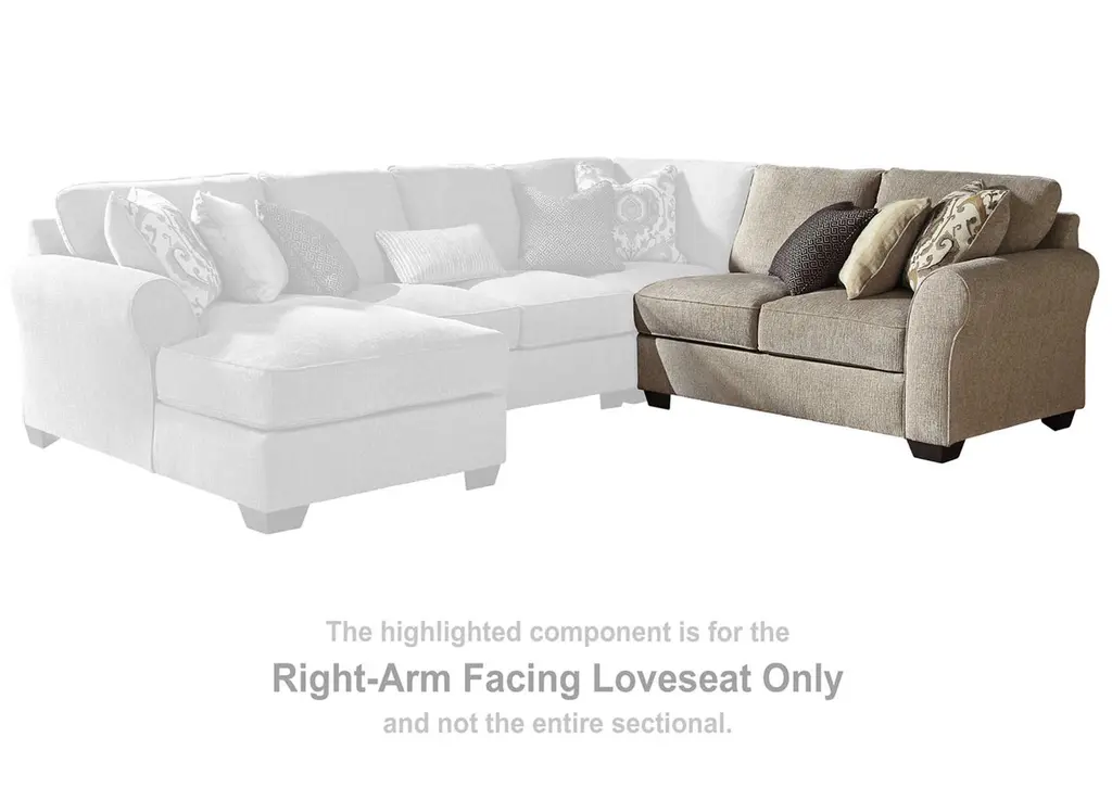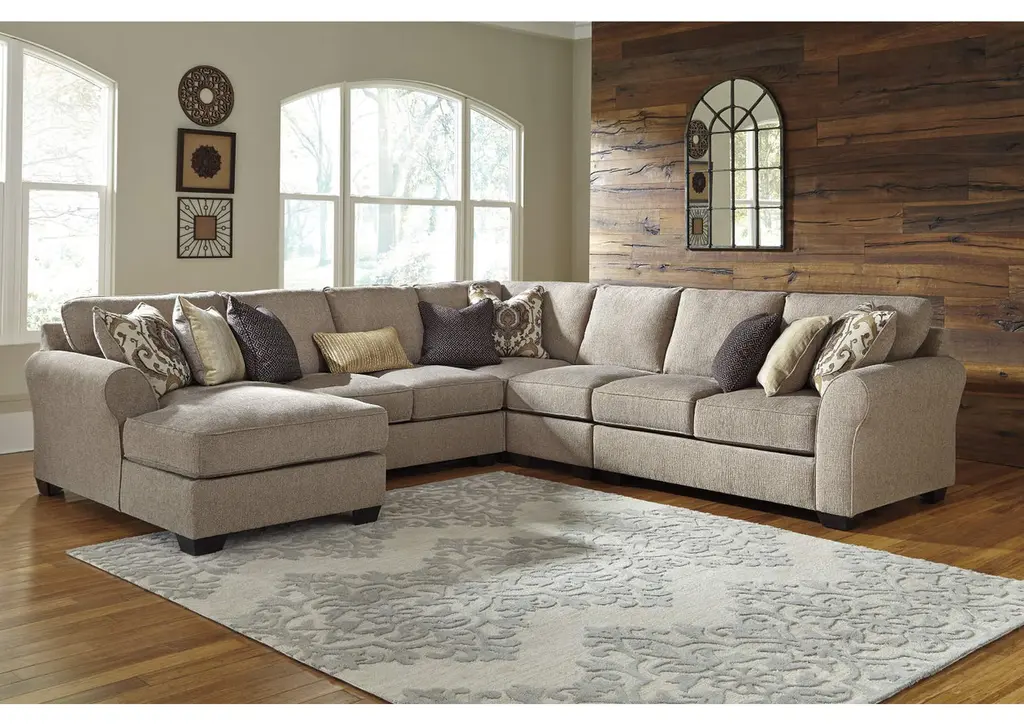 Give your living area a rich, neutral appeal with this comfortably modern sectional in "driftwood" beige. Reversible UltraPlush cushions with high-density foam deliver incredible comfort and support. Elements such as subtle rolled arms hint at classic style, but with smooth curved lines, the look remains contemporary. Subtle and sophisticated, the designer upholstery with multi-tonal interest is a natural complement for so many color schemes. Pillows full of attractive designs and neutral colors are included to complete the look. Weight 406.000 lbs. (182.7kgs.)
