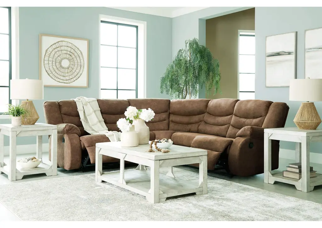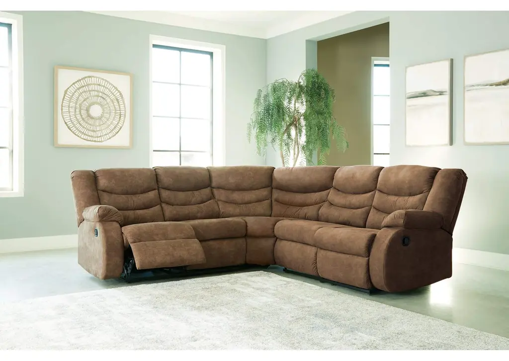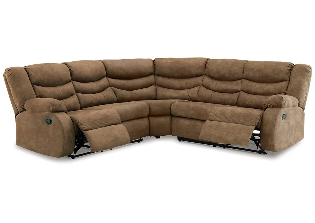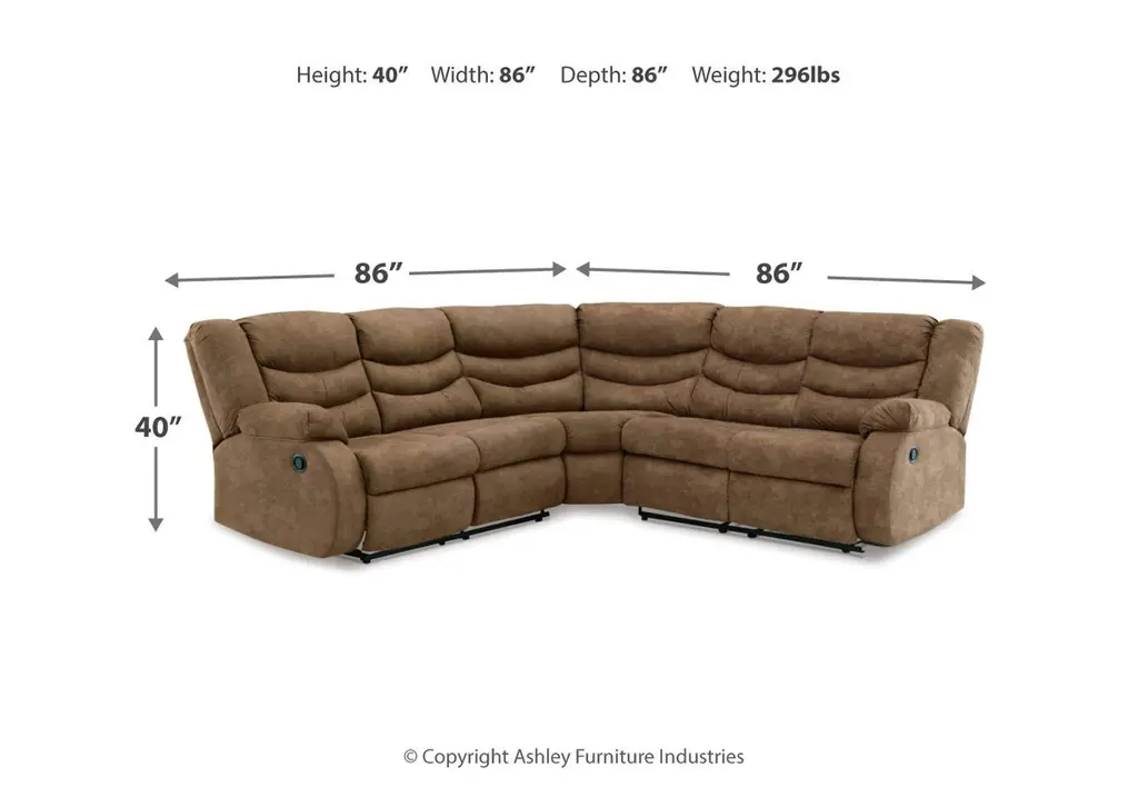 Affordable luxury made easy. An essential for living room lounging, the Partymate sectional is a star in social spaces. Its warm brown faux leather is well-suited for mixing and matching with your existing pieces. Pull tab reclining keeps you and your companions covered when it comes to comfort. And this functional piece is equally as fashionable, with design details like a channel-stitched back incorporating subtle visual interest. Weight 296.000 lbs. (133.2kgs.)