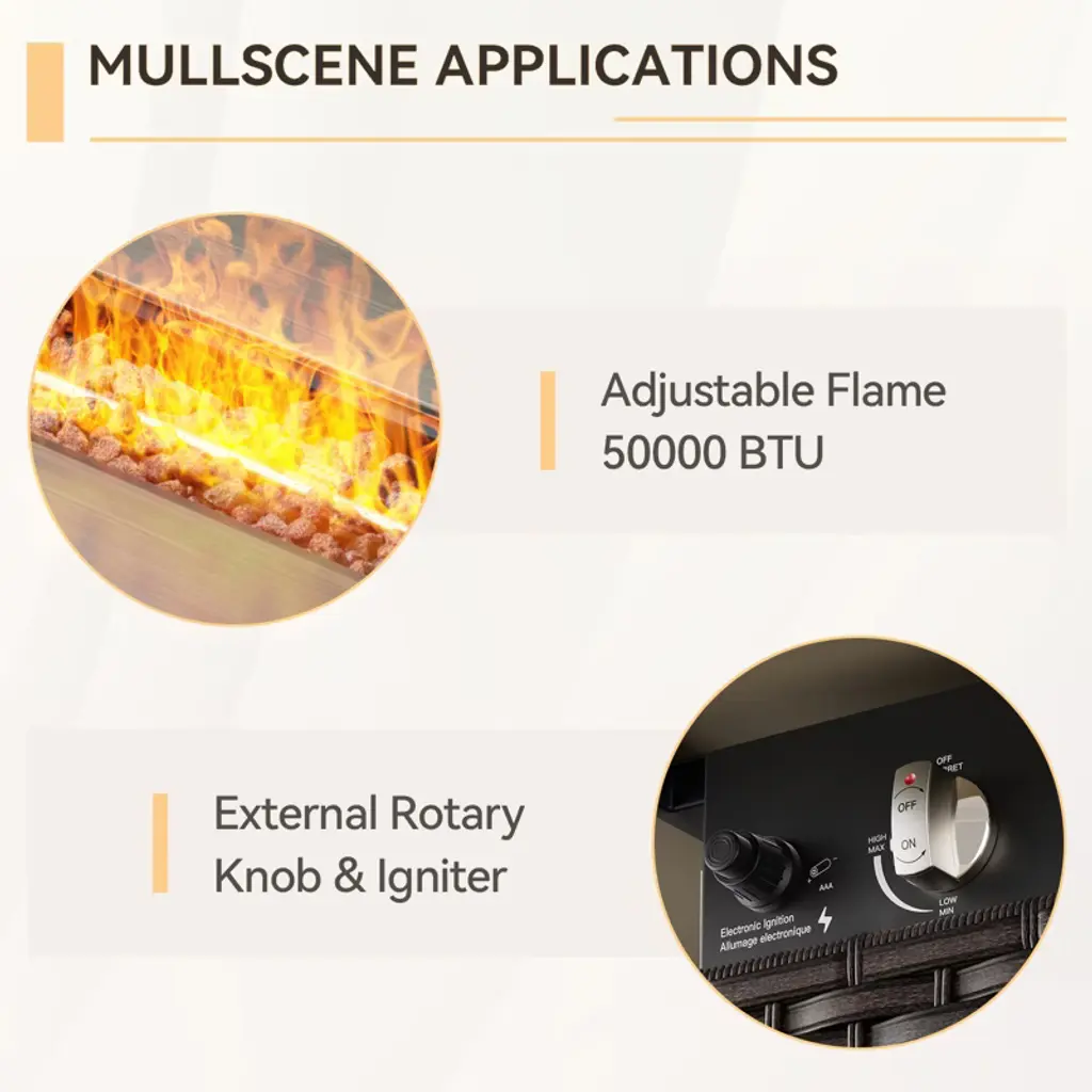 Introducing the POCASSY Outdoor Sectional Sofa Set with Fire Pit Table - a great addition to your outdoor space! This stylish patio set includes an outdoor rattan 3-seater sofa, two outdoor rattan rocking chairs, two rattan curved arm chairs, and a spacious 41" 50,000 BTU propane fire pit table. It features a durable powder-coated steel frame wrapped in hand-woven PE wicker for durability and a stunning focal point. The fire pit table comes with a convenient cover to keep you warm on chilly nights, and easily transforms into a functional dining table in the summer. Whether you're looking to lounge by a cozy fire or enjoy a drink with friends, this set is the ultimate upgrade for outdoor family gatherings.