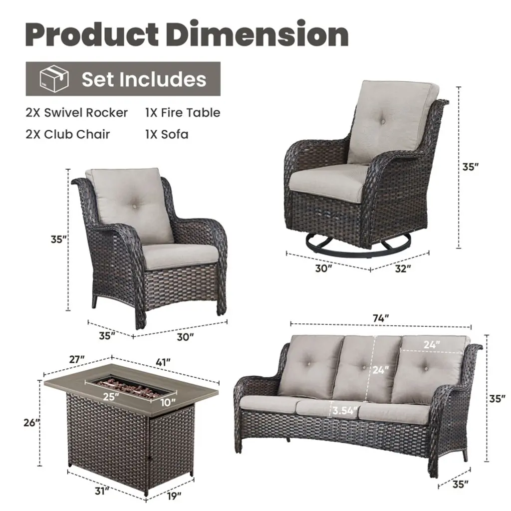 Pocassy 6-piece Outdoor Furniture Set With Fire Pit Table, All Weather Wicker Outdoor Conversation Set Patio Sofa Set With Swivel Chairs And Fire Pit