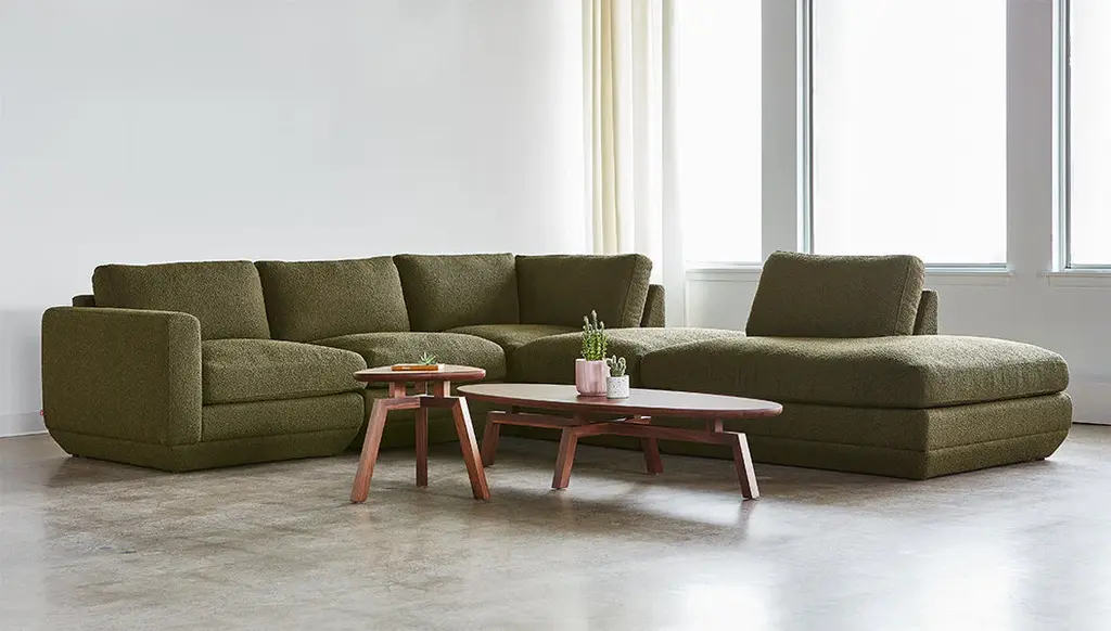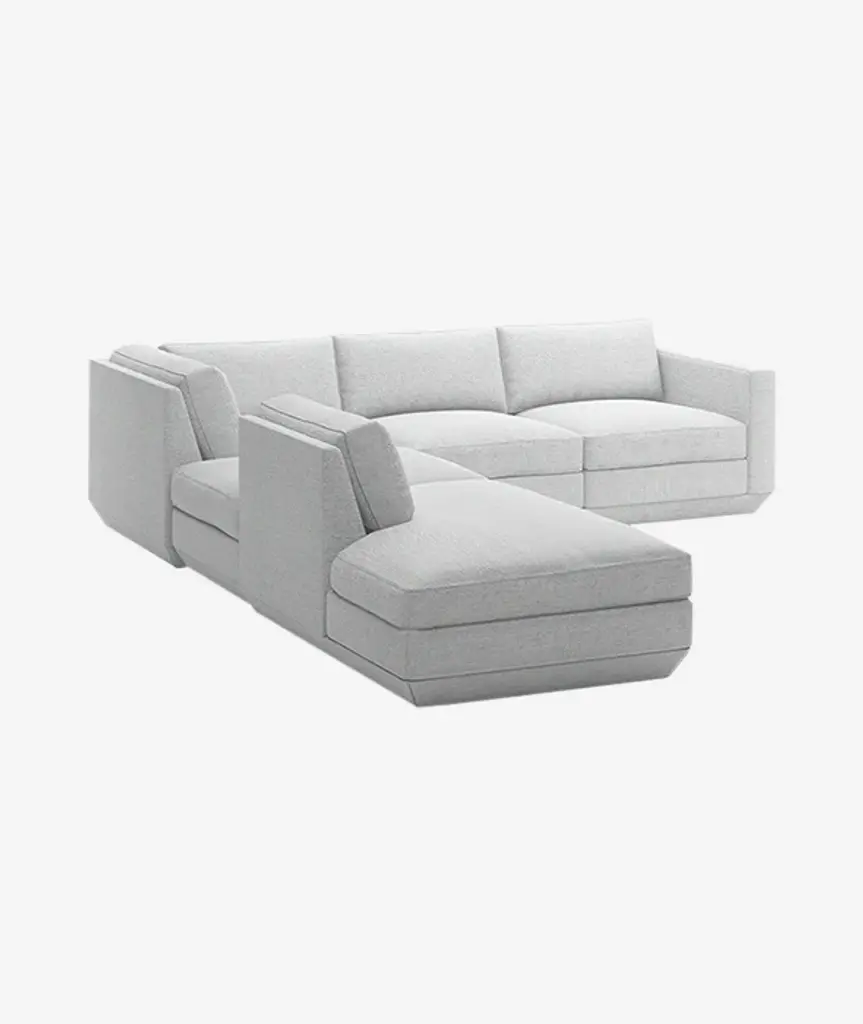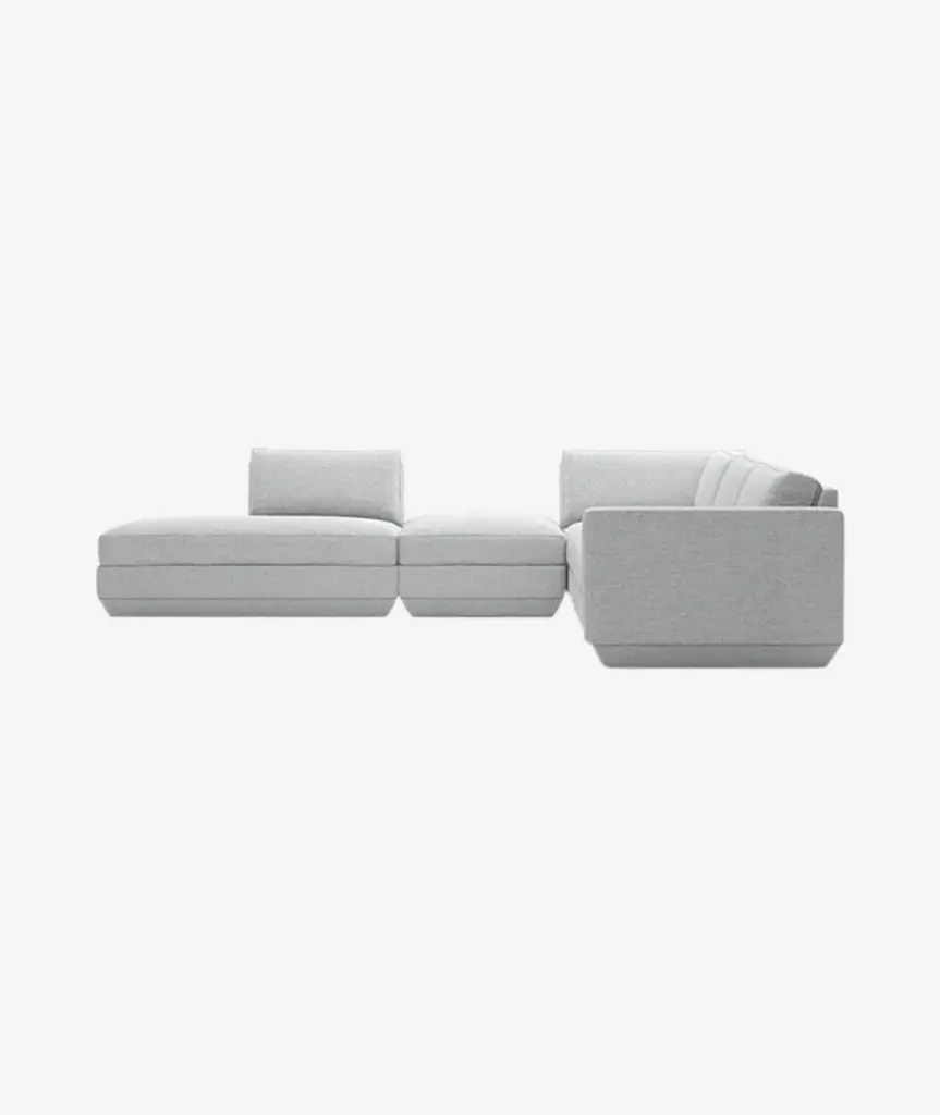 The Podium Modular Collection is an adaptable seating system that brings modern elegance and luxurious comfort to any space. The Podium features seven core components (Right Arm, Left Arm, Armless, Corner, Ottoman, Left Lounge and Right Lounge) that can be arranged in unlimited configurations to suit any vision or layout. Components can then be easily reconfigured or added later to adapt to your evolving lifestyle. Each component showcases a relaxed silhouette inspired by 1970’s Modernism: a low and deep sit created by plush seat and back cushions (filled with eco-friendly synthetic down derived from recycled water bottles), and an attractive, subtly angled, chamfered base.