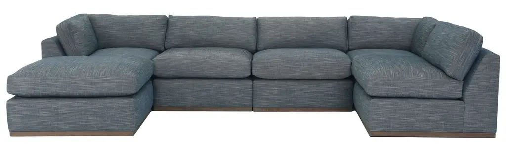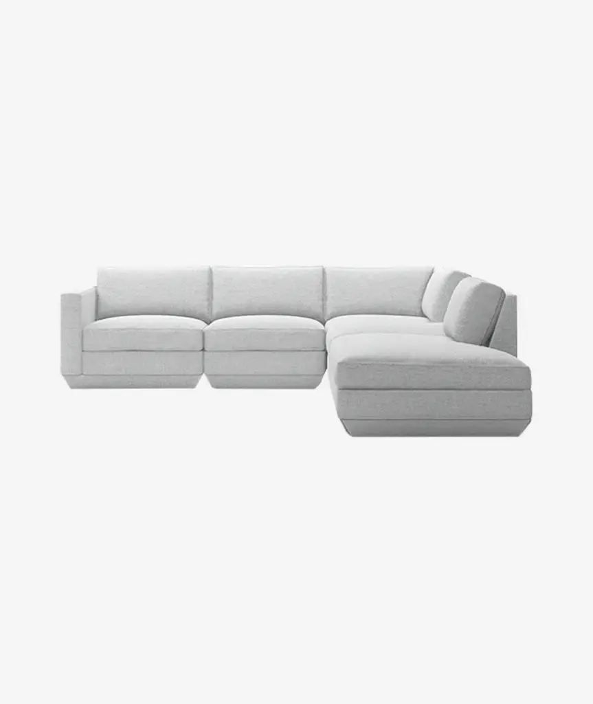 The Podium Modular Collection is an adaptable seating system that brings modern elegance and luxurious comfort to any space. The Podium features seven core components (Right Arm, Left Arm, Armless, Corner, Ottoman, Left Lounge and Right Lounge) that can be arranged in unlimited configurations to suit any vision or layout. Components can then be easily reconfigured or added later to adapt to your evolving lifestyle. Each component showcases a relaxed silhouette inspired by 1970’s Modernism: a low and deep sit created by plush seat and back cushions (filled with eco-friendly synthetic down derived from recycled water bottles), and an attractive, subtly angled, chamfered base.