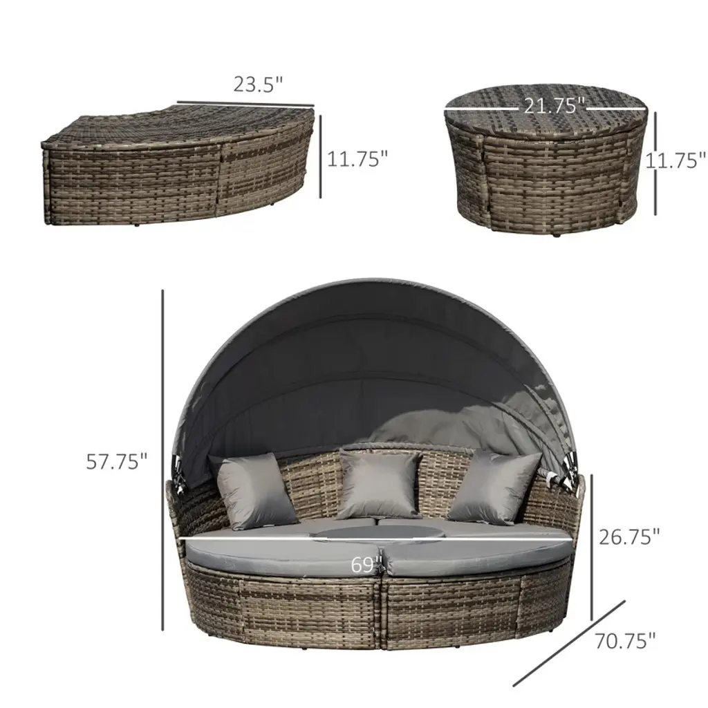 Resenkos 4-piece Round Convertible Daybed With Cushions, Outdoor Sectional Furniture, Pe Rattan, Gray