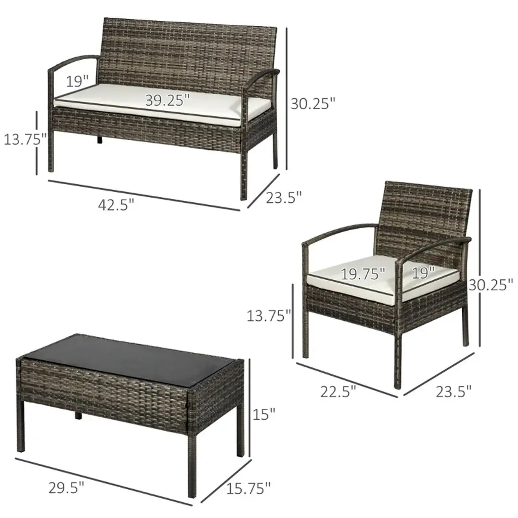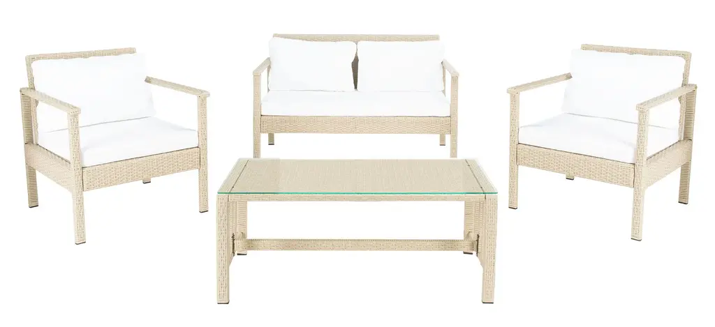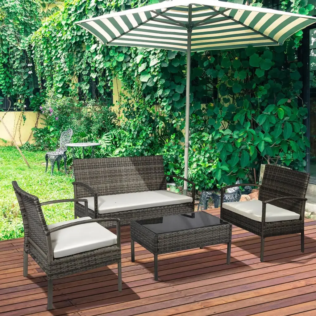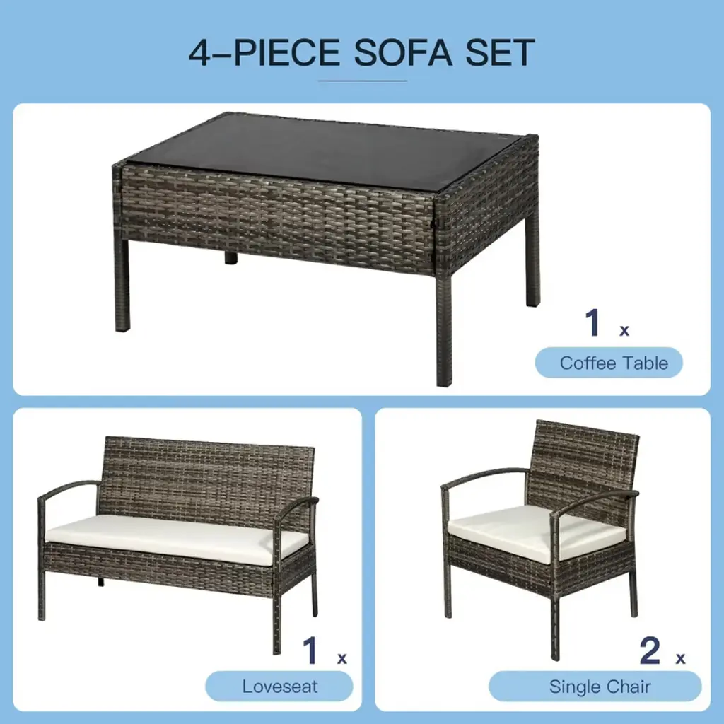 Experience ultimate comfort and style with the Resenkos 4-Piece Patio Furniture Set. This indoor outdoor conversation set includes chairs, loveseat sofa, cushions, and a glass table, perfect for your backyard, sunroom, poolside, garden, or any outdoor space. Crafted from durable PE wicker, this set is designed to withstand various weather conditions. The light gray color adds a touch of elegance to your outdoor area. Enjoy a cozy gathering with friends and family, whether it's a sunny day or a relaxing evening. Elevate your outdoor living with Resenkos's high-quality furniture set.