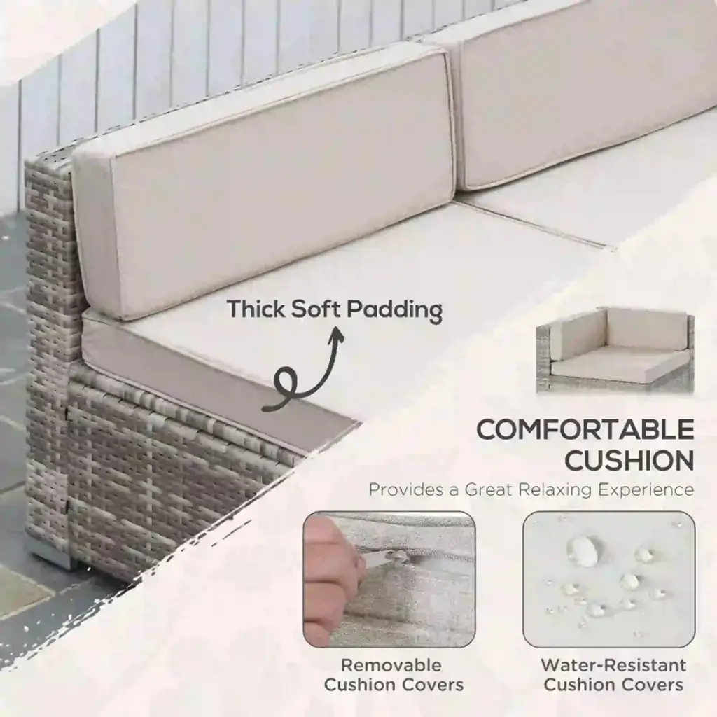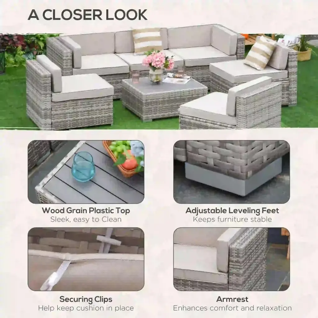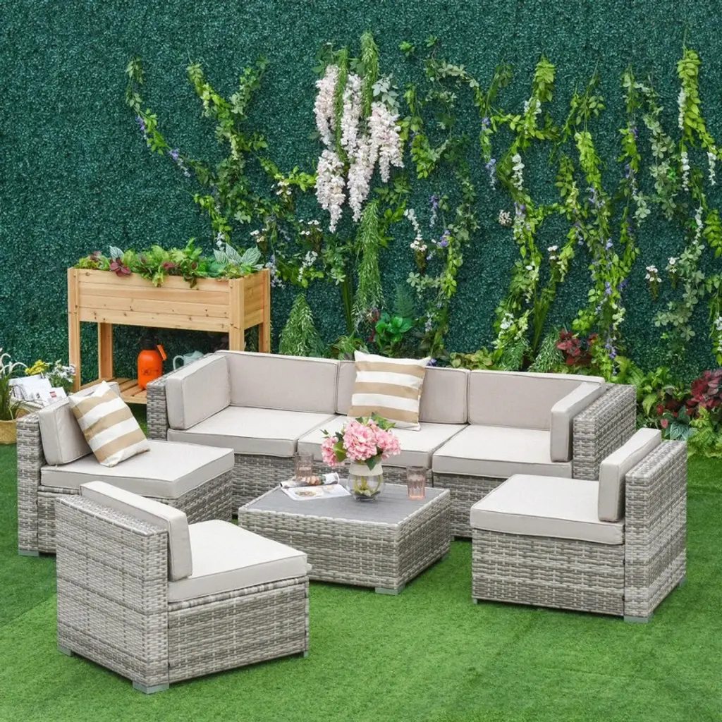 Experience ultimate comfort with the Resenkos 7-Piece Outdoor Wicker Patio Sofa Set, a modern rattan conversation furniture set that seamlessly blends style and functionality. This beige masterpiece includes plush cushions and a convenient tea table, perfect for relaxing and entertaining. Crafted from high-quality materials, this sofa set is designed to withstand the elements, ensuring years of enjoyment. Embrace the beauty of outdoor living with Resenkos's modern rattan patio furniture set, featuring a sleek design and durable construction. Ideal for small to medium-sized patios, decks, or balconies, this set is a must-have for anyone seeking a cozy outdoor retreat. Transform your outdoor space into a luxurious oasis with the Resenkos 7-Piece Outdoor Wicker Patio Sofa Set, offering exceptional comfort, stylish aesthetics, and practicality.