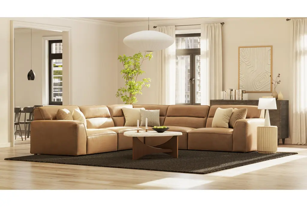 Rhone 122" Light Brown Beige Leather 5 Piece Modular L-Shaped Sectional | Reversible