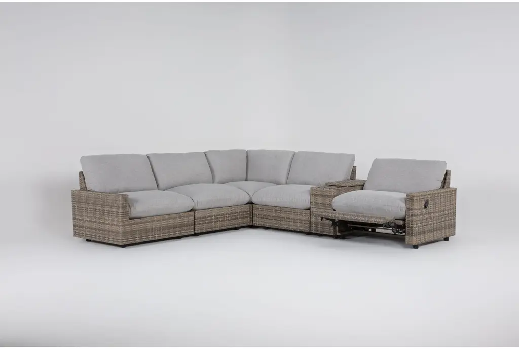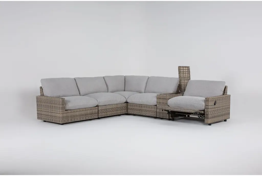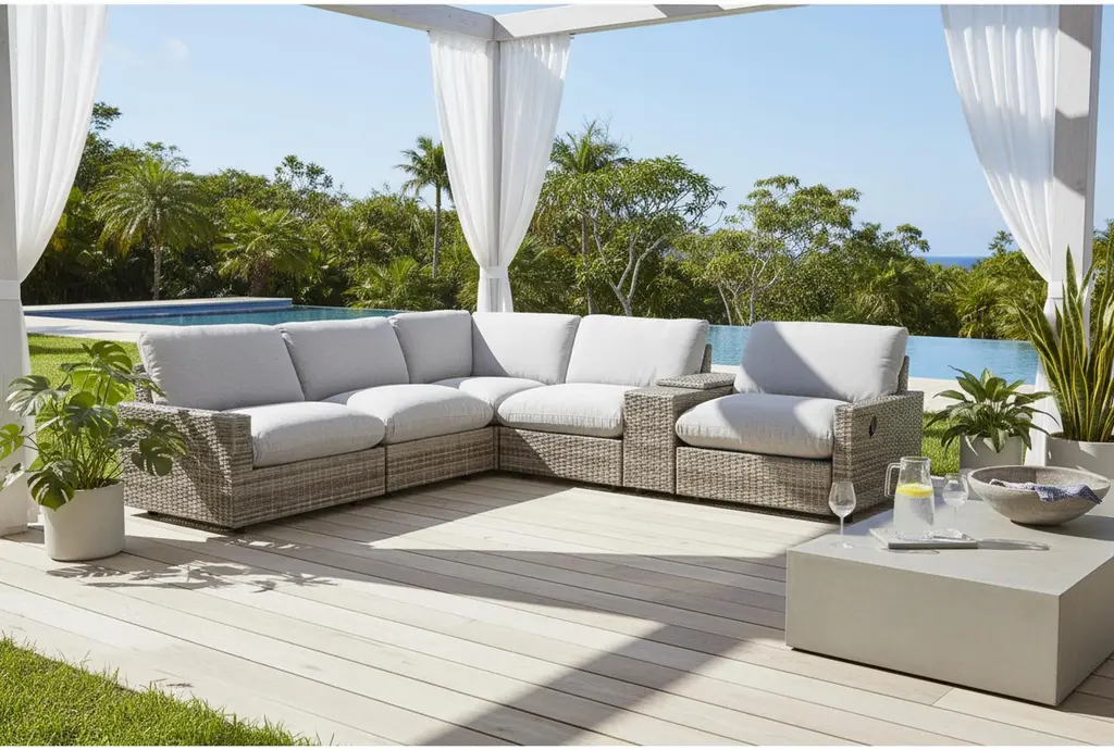 Riviera Cloud 117" 6 Piece Natural Beige Reclining Outdoor Sectional With Right Arm Facing Recliner + Console | Fabric