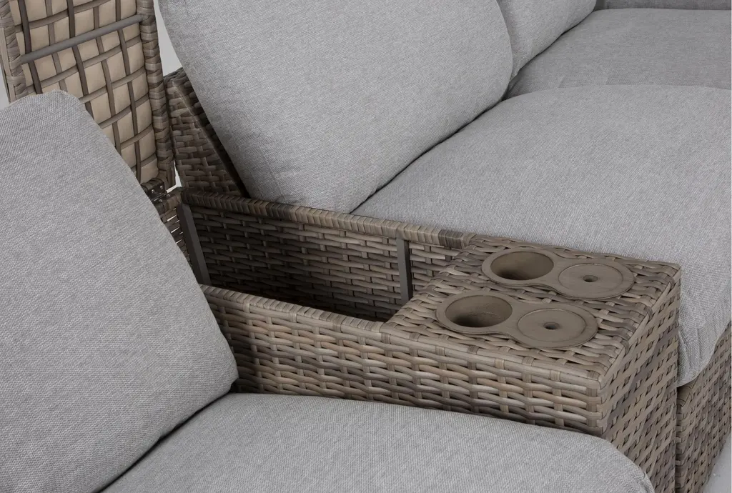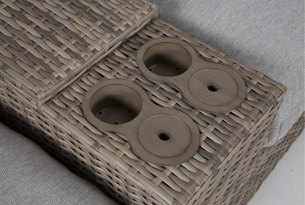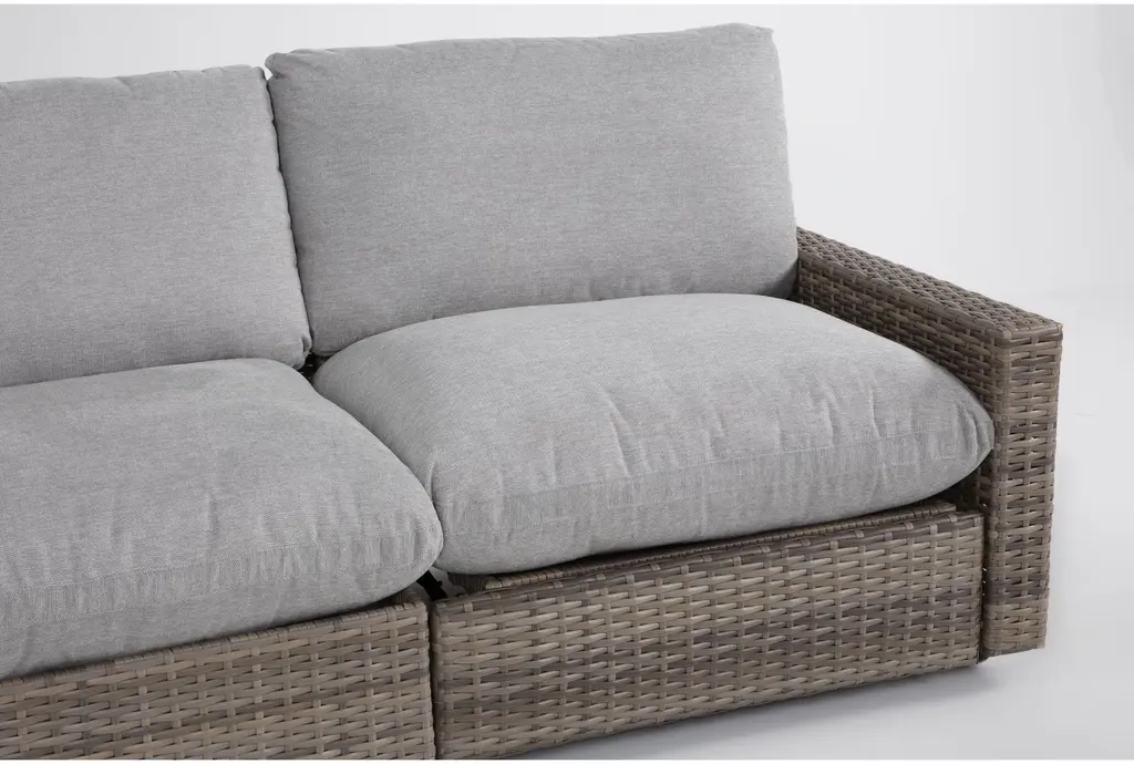 You won’t be able to resist the allure of your backyard when our reclining Riviera outdoor sectional is there to provide a destination for relaxation. Perfect for days of sunbathing and evenings spent stargazing, the design is exceptionally comfortable, durable and stylish. Modular components allow you to create a configuration that fits your space. The sectional pieces boast rust-proof, powder-coated aluminum frames wrapped in handwoven virgin resin wicker. Plush cloud-like cushions upholstered in solution-dyed polyester top things off and bring indoor luxury out. For extra indulgent patio lounging, there's added reclining and a console with storage and cupholders.