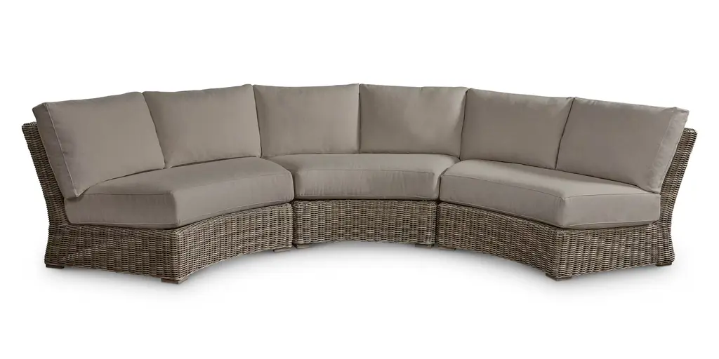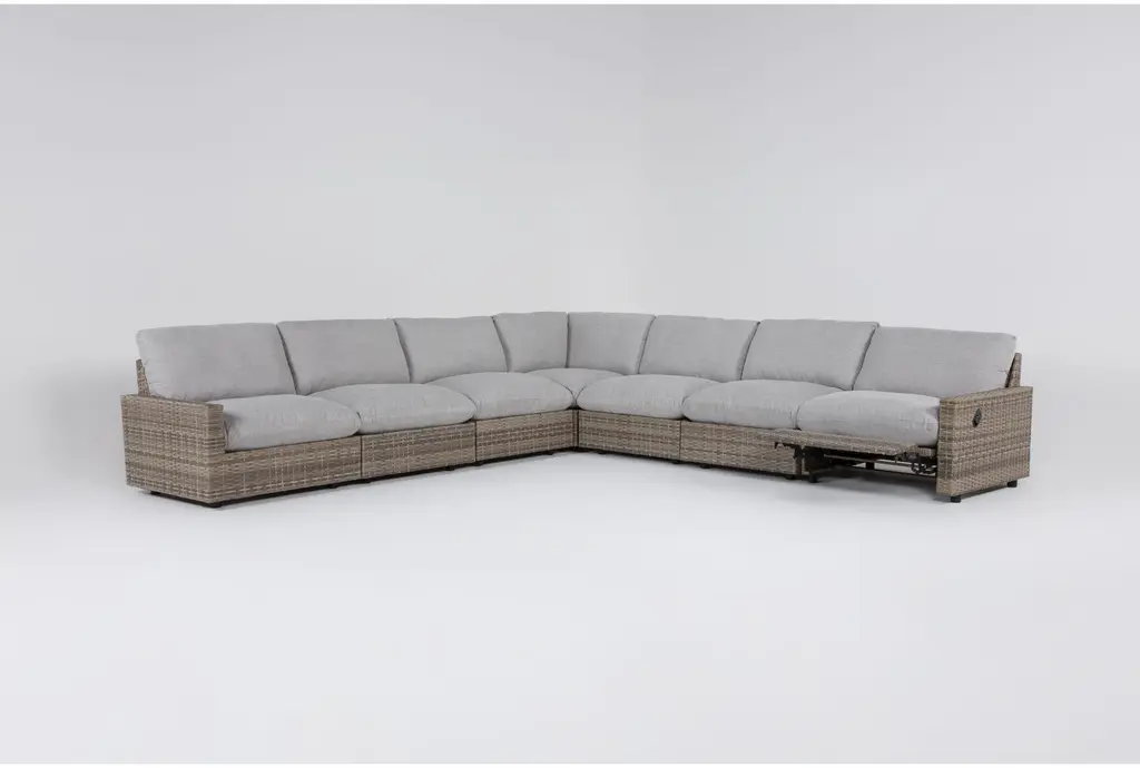 Experience the ultimate in outdoor relaxation with the Riviera Cloud Natural Beige 156" 7 Piece Reclining Outdoor Sectional. This modern sectional features a left arm facing recliner, perfect for unwinding in style. The natural and beige color palette combined with durable resin wicker and aluminum construction ensures long-lasting use and comfort.