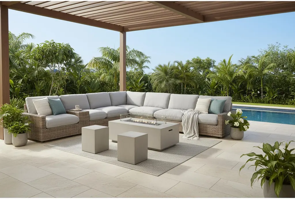 Introducing the Riviera Cloud Natural Beige 8 Piece Sectional, the perfect addition to your outdoor living space. Designed in a modern style, this sectional offers comfort and versatility with its reversible orientation and beach grass color. Made with resin wicker, aluminum, and foam, it promises durability and resilience for high-traffic outdoor areas.