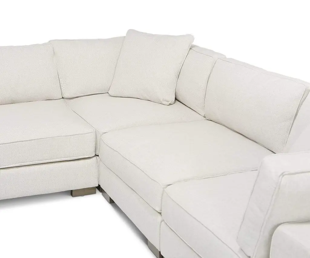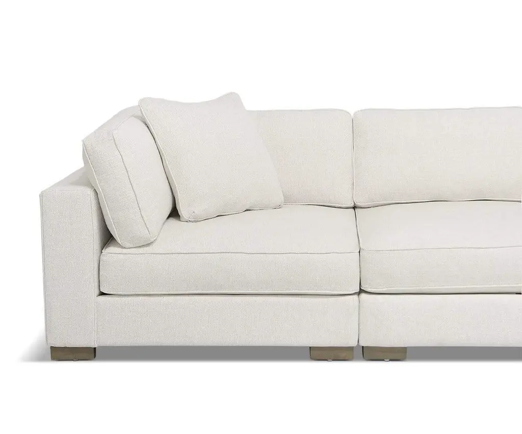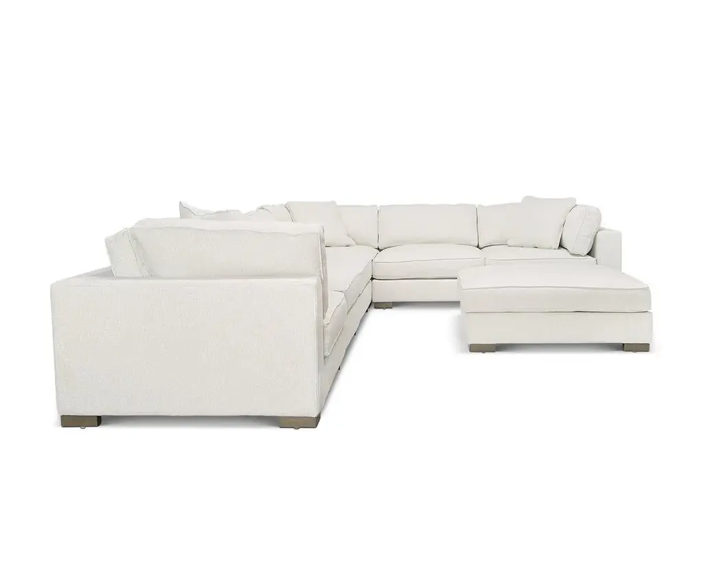 The Roanne Modular Sectional provides comfortable seating for the entire family. The approachable modular design provides flexibility and can be configured in many ways, within any space. The clean modern lines blend with any decor style while plush feather blend cushions and deep seats maximize the feelings of restorative leisure. Kick up your feet on the ottoman, which can be moved to either side of the sectional for even more flexibility. The off-white fabric upholstery is durable yet soft, and contrasts nicely with wood block feet. Made in the USA.