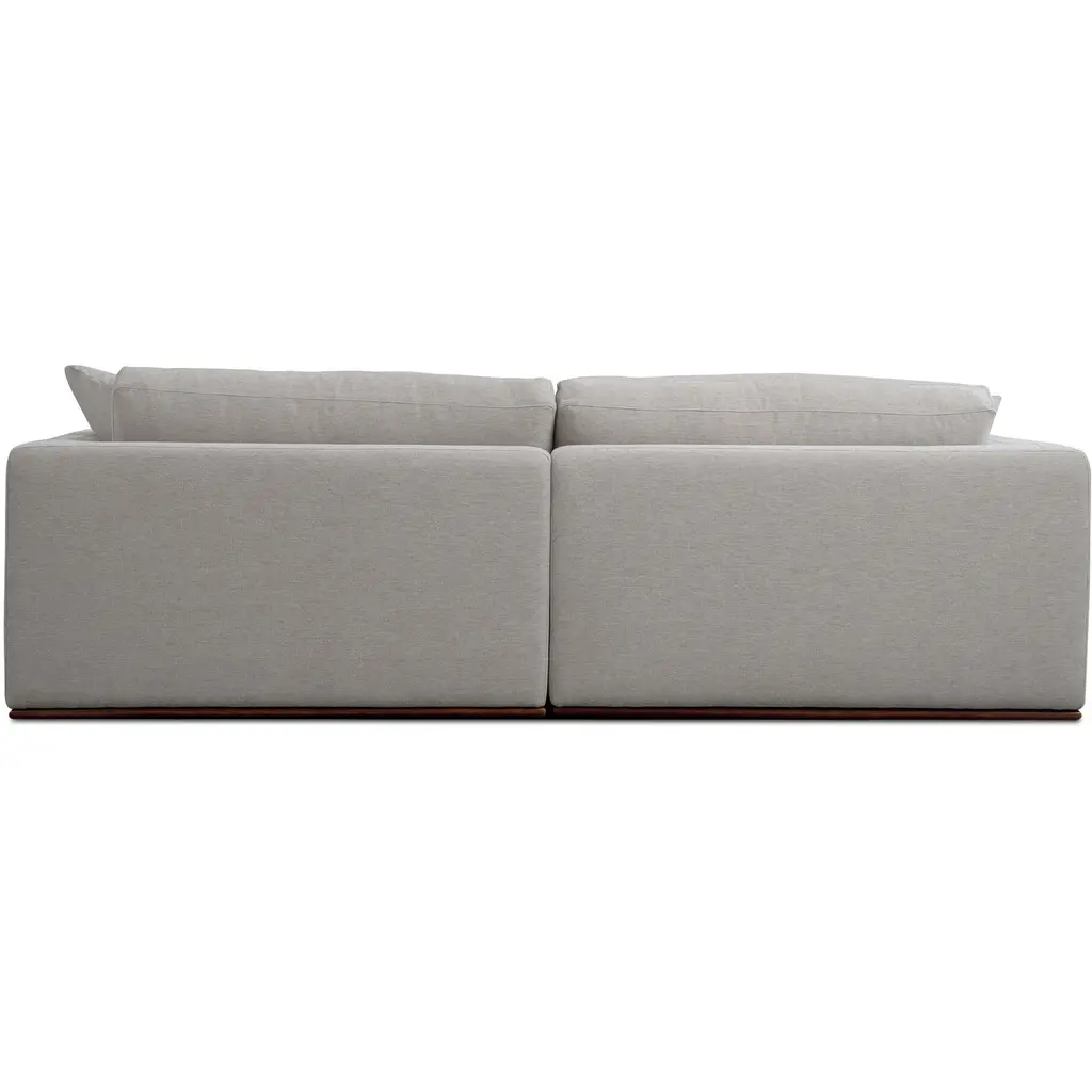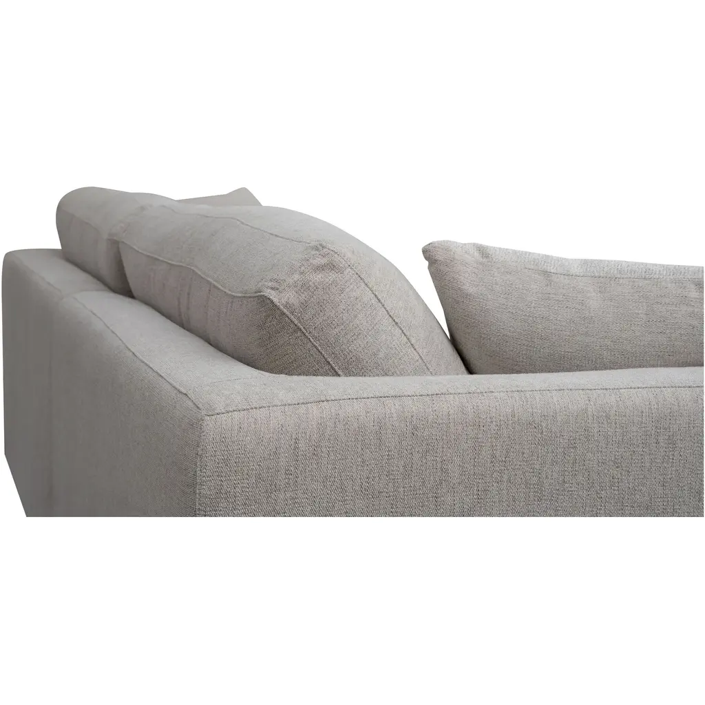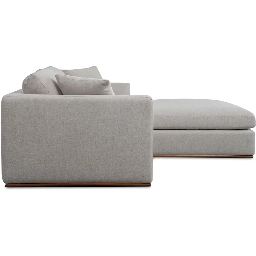 The Rue modular sectional features a generous 70% feather-fill topper within its seating, accompanied by toss cushions for an added layer of coziness. Its elegant silhouette is highlighted by a rubber wood base, creating a sleek floating appearance, all supported by subtle wooden legs. Designed with extreme comfort in mind, this modular embodies easy, neutral styling.