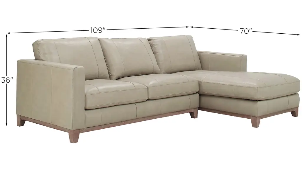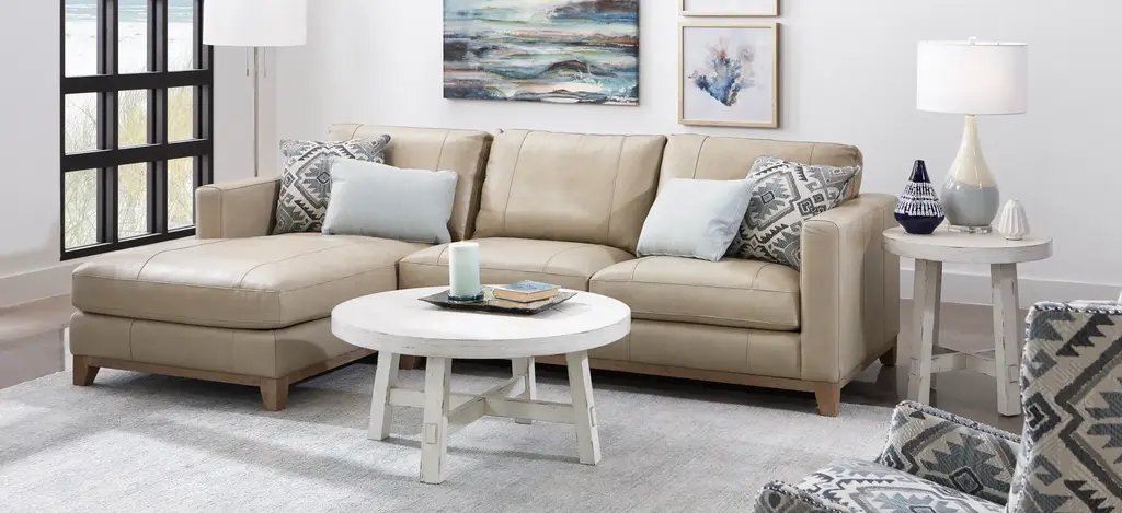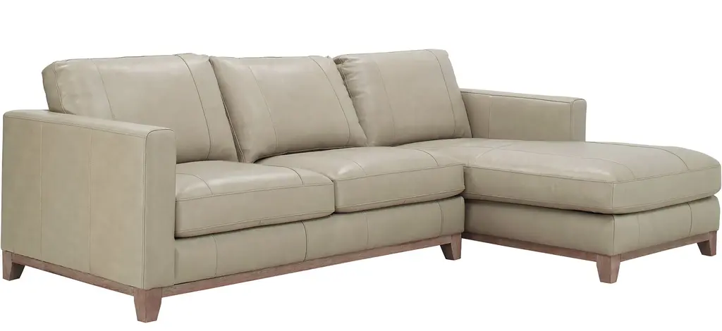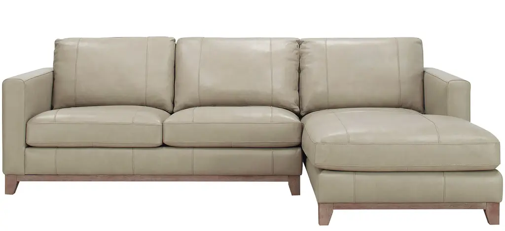 For the best in style and comfort, look no further than the Ryland 2-pc. sectional. Top-grain beige leather on the cushions and arms are smooth and soft, and are also versatile enough to match any color scheme you choose.