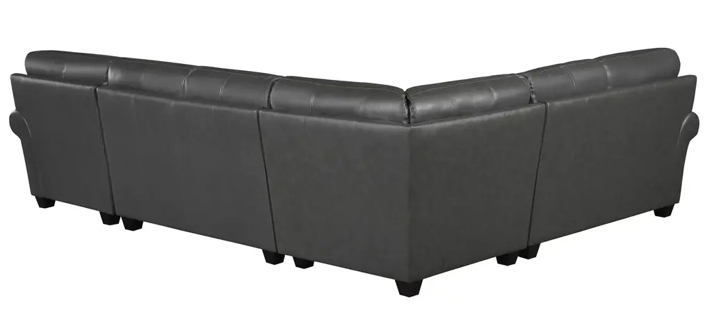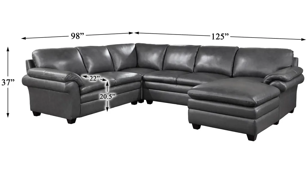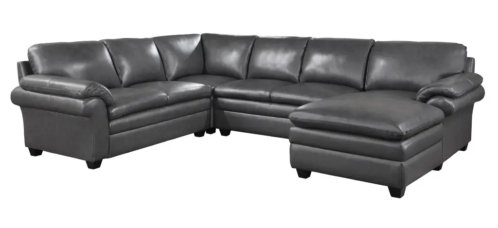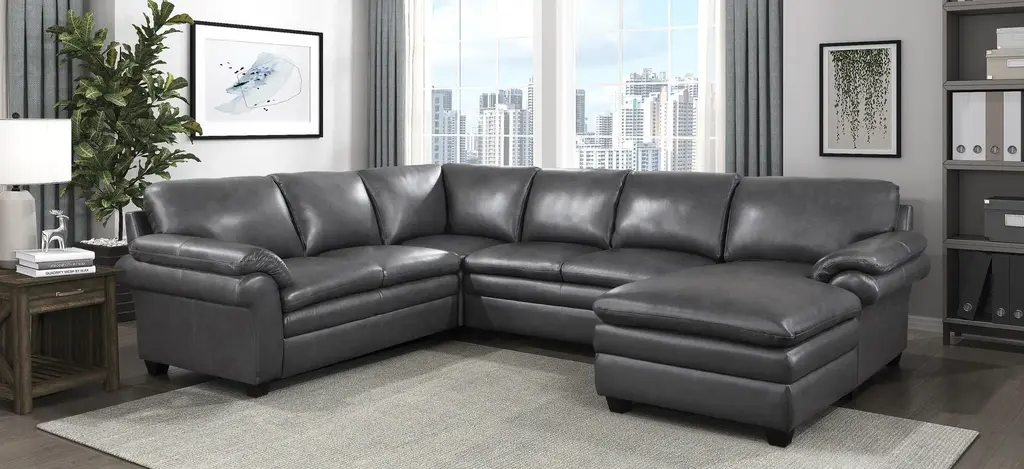 The plush seating of the Sarasota 4-pc. Sectional provides ample space for your family and friends to gather in enveloping comfort. The sectional features a gray top-grain leather cover - with faux leather match - furthering the comfort of your seated experience. The collection is comprised of a right-side chaise, armless two-seat segment, corner unit and left-side two-seater. The transitional design of the collection pairs perfectly with your home's casual living space.